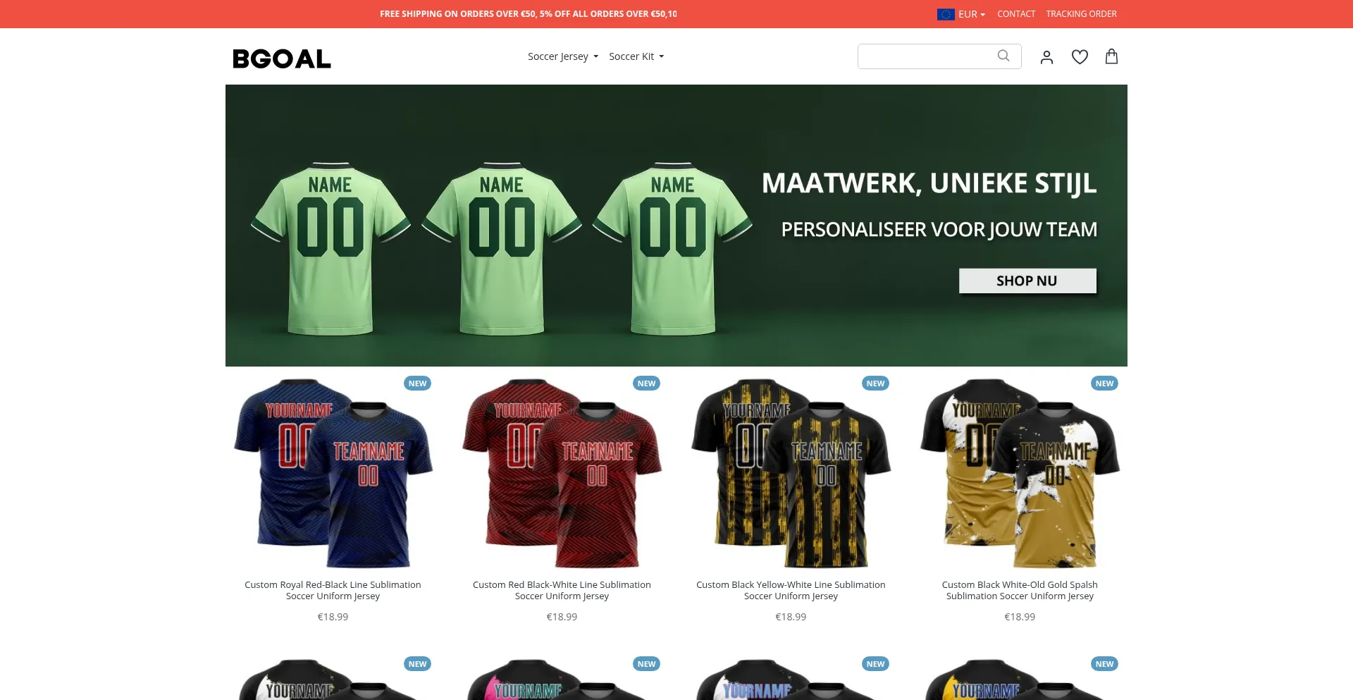 Ontwerp je ideale voetbalshirt met eigen naam, nummer en design. Professionele druktechniek op ademende stof voor teams en fans.