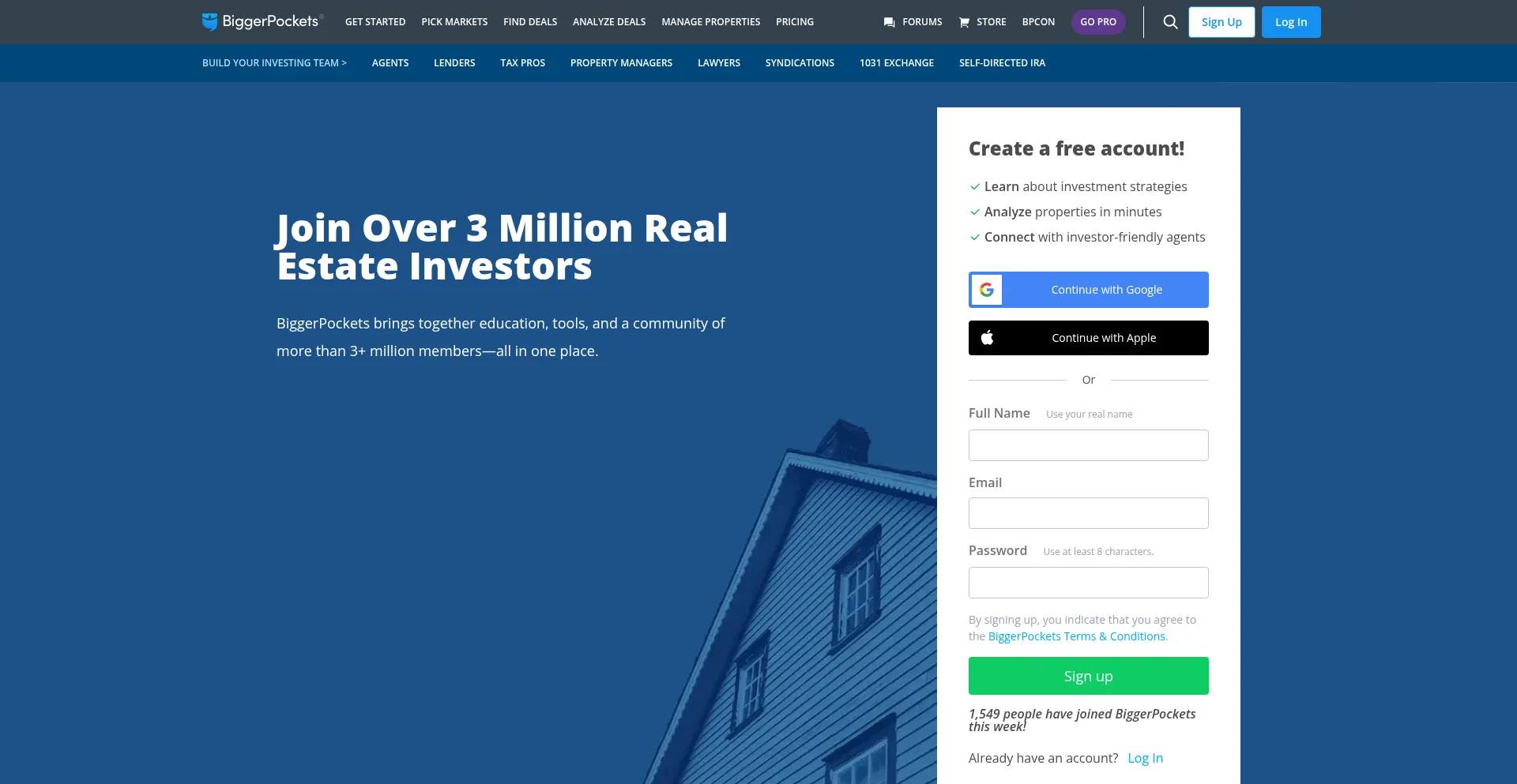 该网站实现数据收集表单,请求个人信息,包括姓名、电子邮件地址、电话号码或其他敏感详细信息。用户应验证 biggerpockets.com 的合法性并在提交个人数据前查看隐私政策。