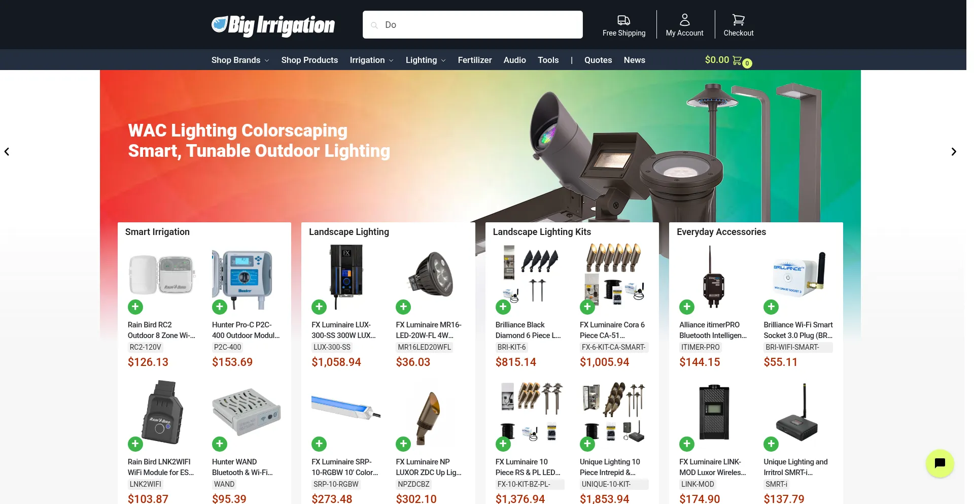 Shop Big Irrigation Supply for Wi-Fi controllers, rotors, sprinklers, spray heads, valves, backflow preventers, landscape lighting, and outdoor audio.