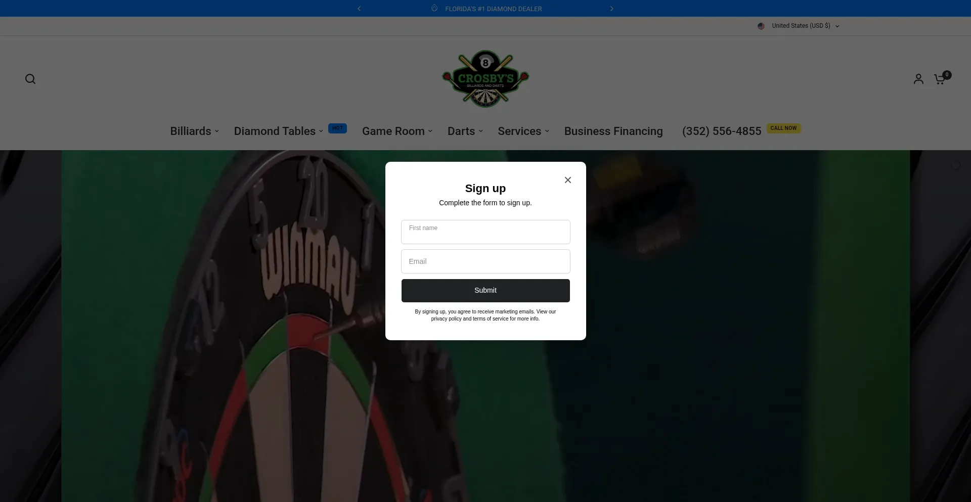 该网站实现数据收集表单,请求个人信息,包括姓名、电子邮件地址、电话号码或其他敏感详细信息。用户应验证 billiardsanddarts.com 的合法性并在提交个人数据前查看隐私政策。