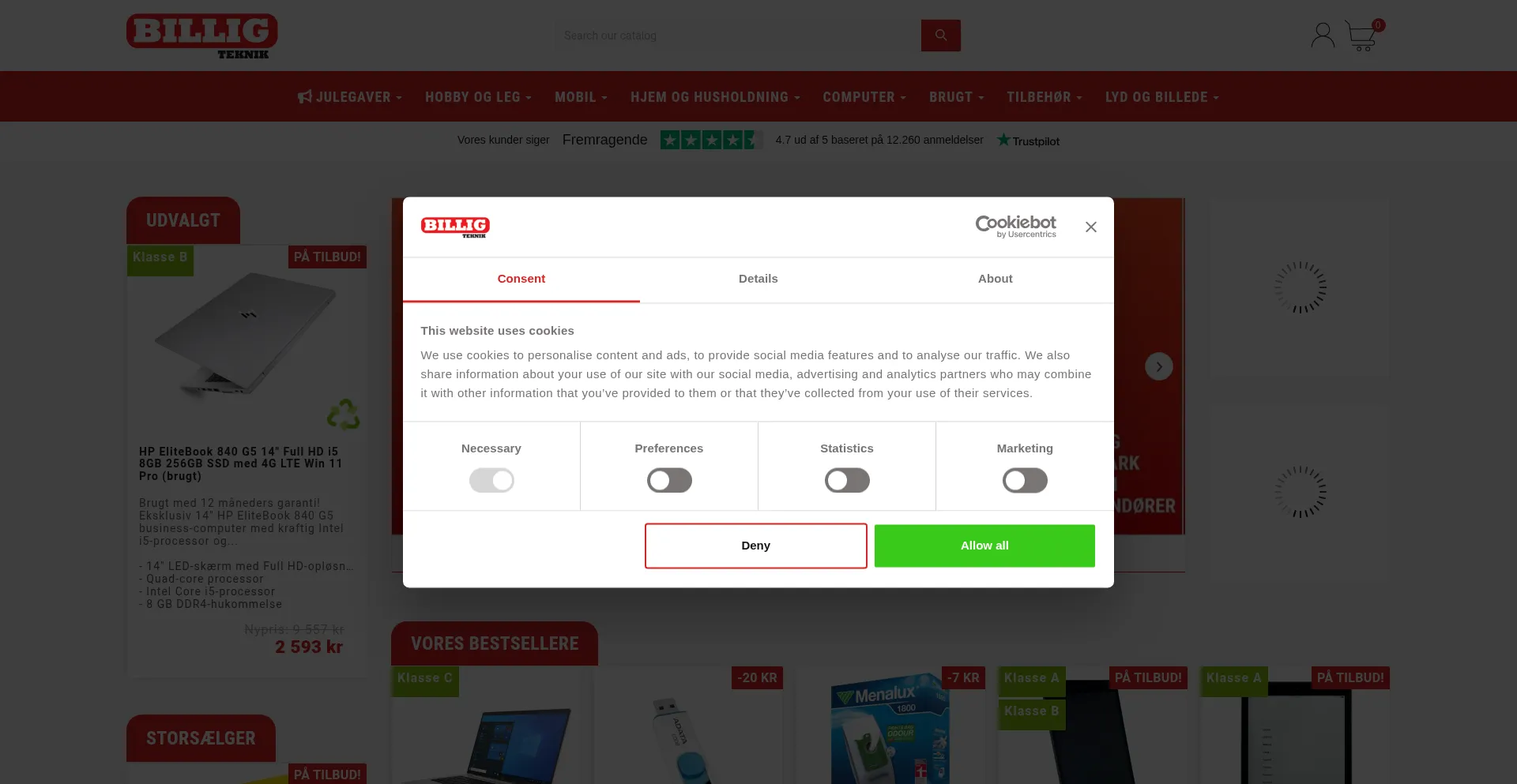 该网站实现符合GDPR或CCPA等隐私法规的cookie同意机制。这表明 billigteknik.dk 遵守数据保护标准并为用户提供对个人数据收集实践的控制。