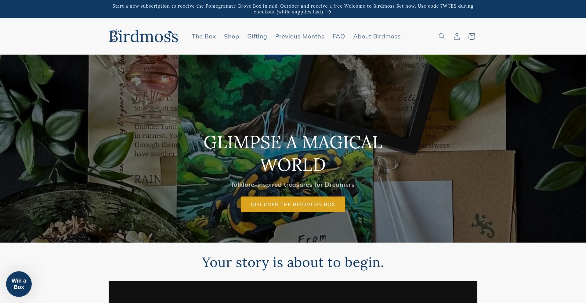 The Birdmoss Box is an immersive fairy tale told through mysterious documents, poems and prose, and a monthly subscription box of sensory delights. Treasures such as tiny terrar...