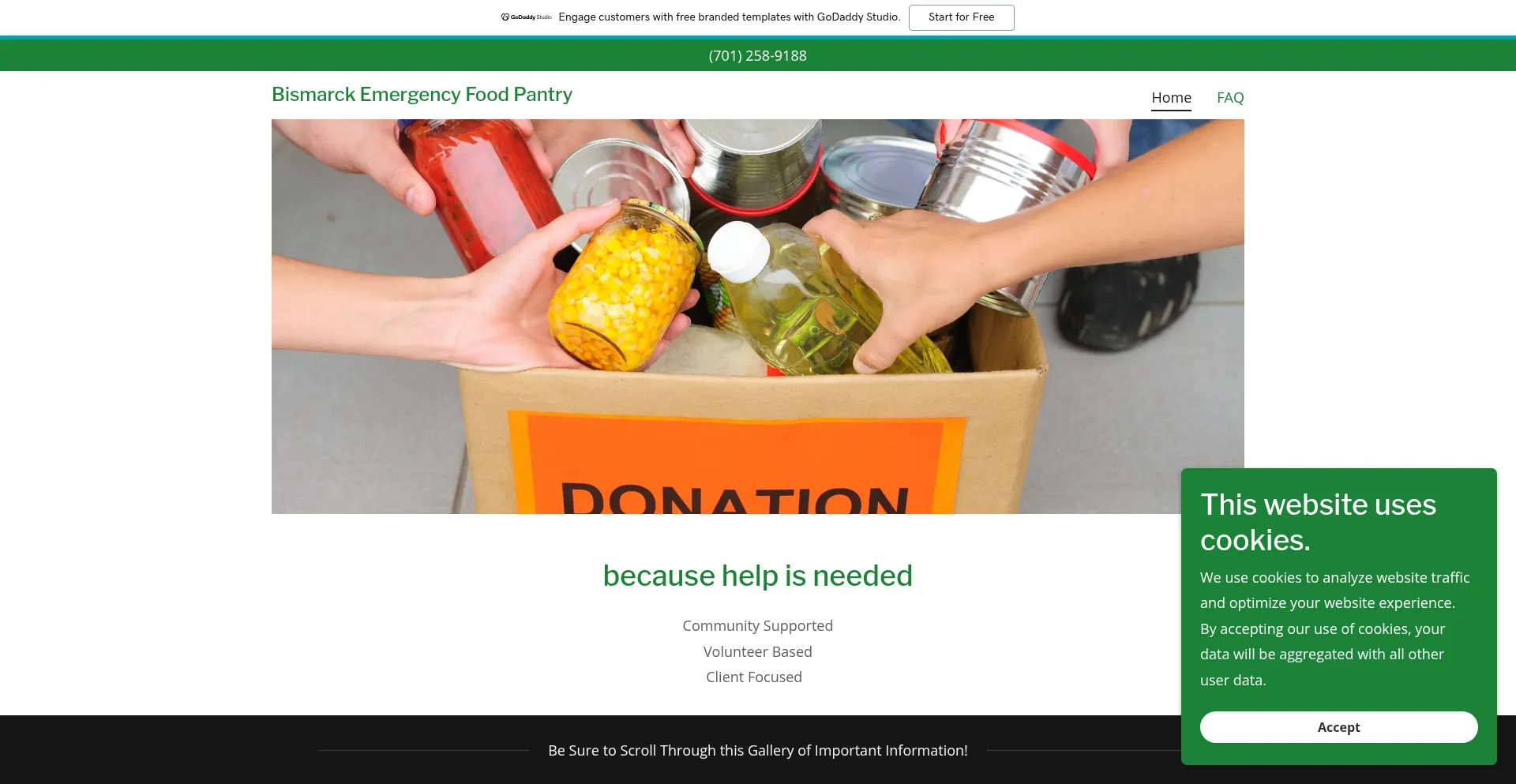 该网站实现符合GDPR或CCPA等隐私法规的cookie同意机制。这表明 bismarckemergencyfoodpantry6.godaddysites.com 遵守数据保护标准并为用户提供对个人数据收集实践的控制。