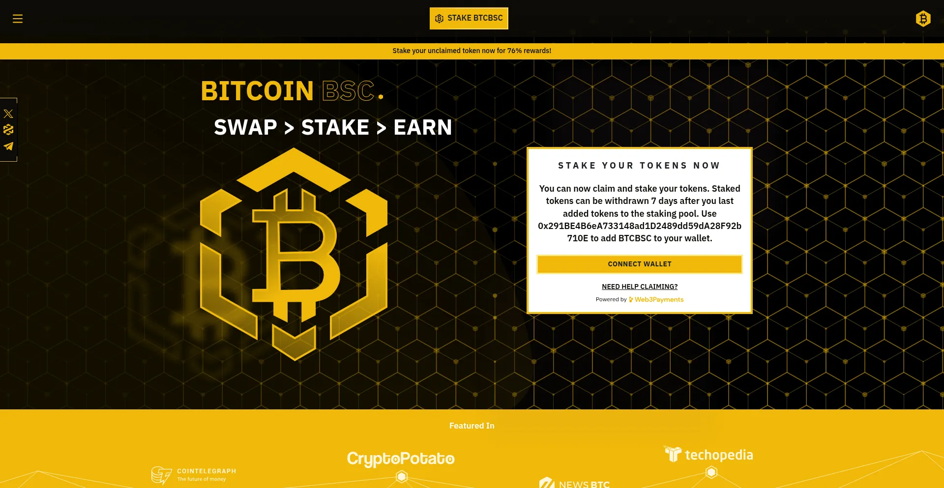Buy Bitcoin BSC and stake to earn rewards every 10 minutes. A new Bitcoin on BNB Smart Chain enhanced by smart contract technology.