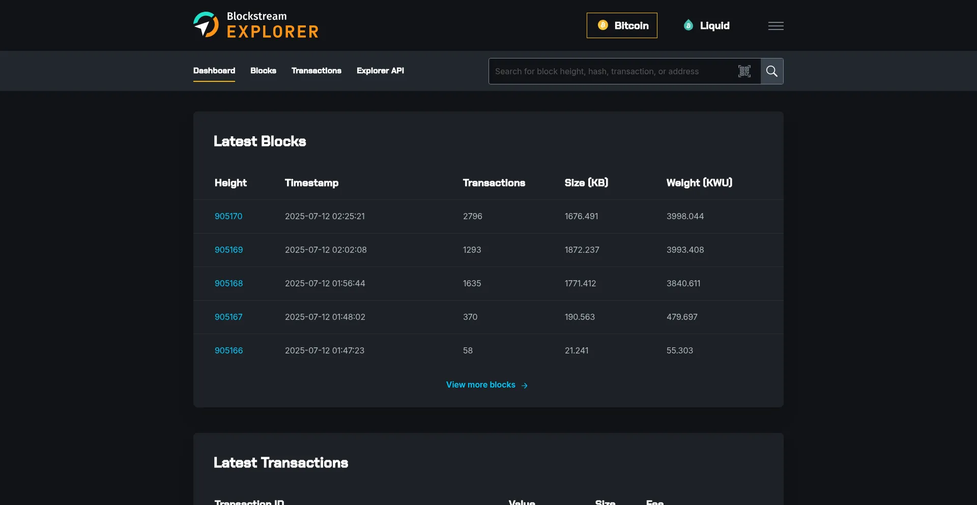 Blockstream Explorer is an open source block explorer providing detailed blockchain data across Bitcoin, Testnet, and Liquid. Supports Tor and tracking-free.