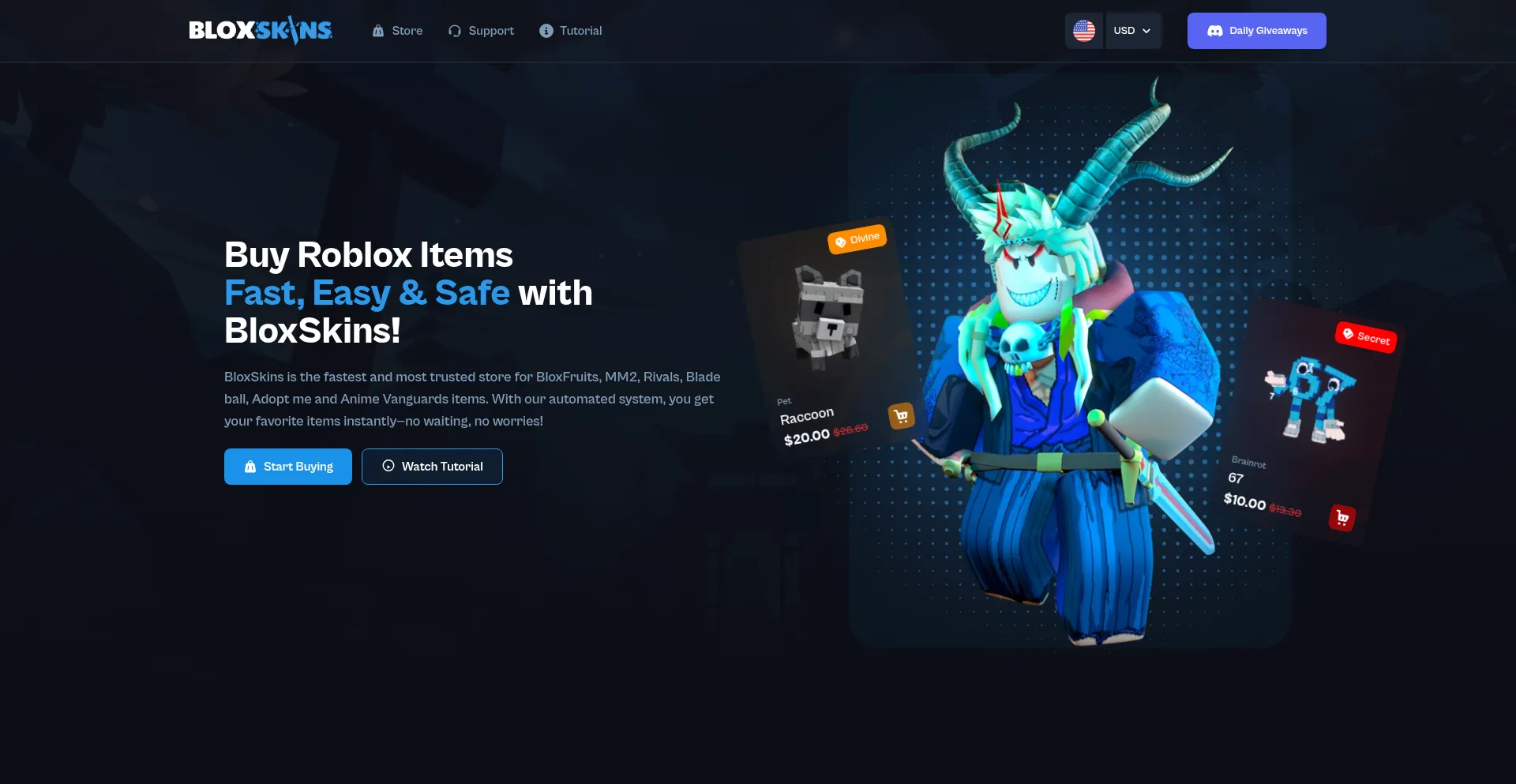 Shop the best deals on Roblox items at BloxSkins! Buy Blox Fruits, Grow a Garden seeds and gear, Blue Lock styles and passes, Anime Vanguards, Rivals, Murder Mystery 2, Pets Go,...