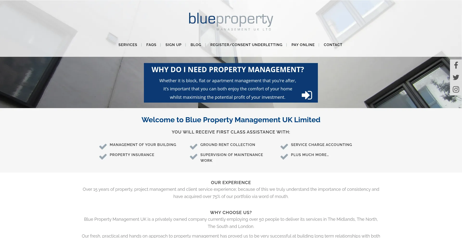 网站上存在社交媒体链接表明 bluepropertymanagementuk.com 在社交媒体上维护官方账户,这是可信度和参与度的积极信号。