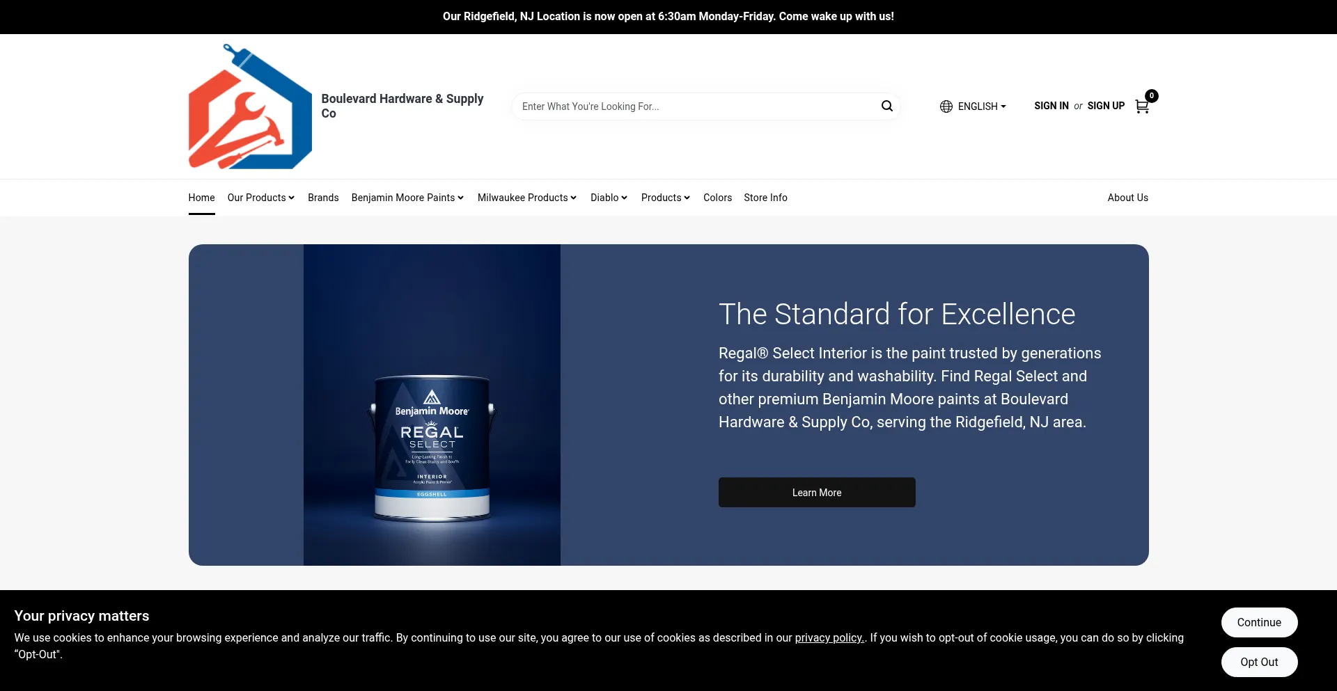 该网站实现符合GDPR或CCPA等隐私法规的cookie同意机制。这表明 blvdhardware.com 遵守数据保护标准并为用户提供对个人数据收集实践的控制。