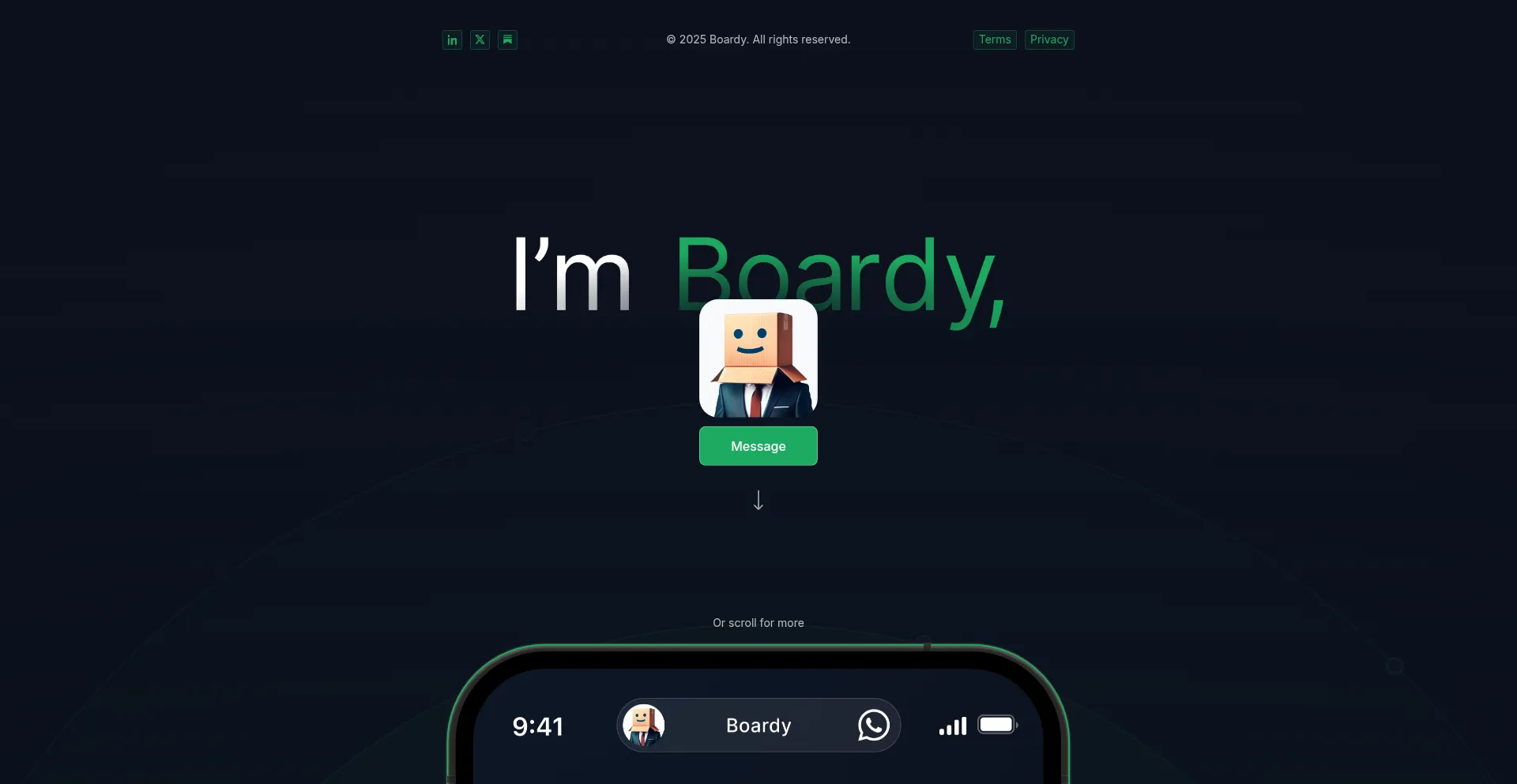 网站上存在社交媒体链接表明 boardy.ai 在社交媒体上维护官方账户,这是可信度和参与度的积极信号。