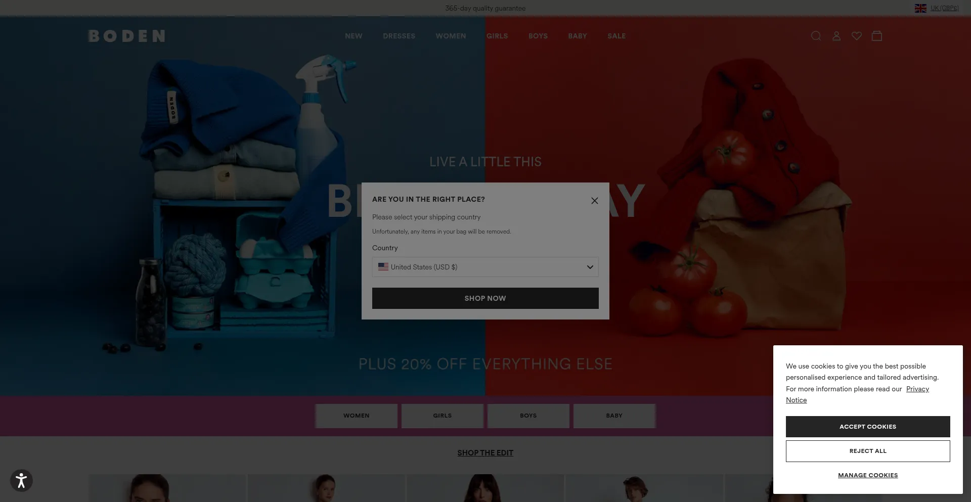 该网站实现符合GDPR或CCPA等隐私法规的cookie同意机制。这表明 boden.co.uk 遵守数据保护标准并为用户提供对个人数据收集实践的控制。