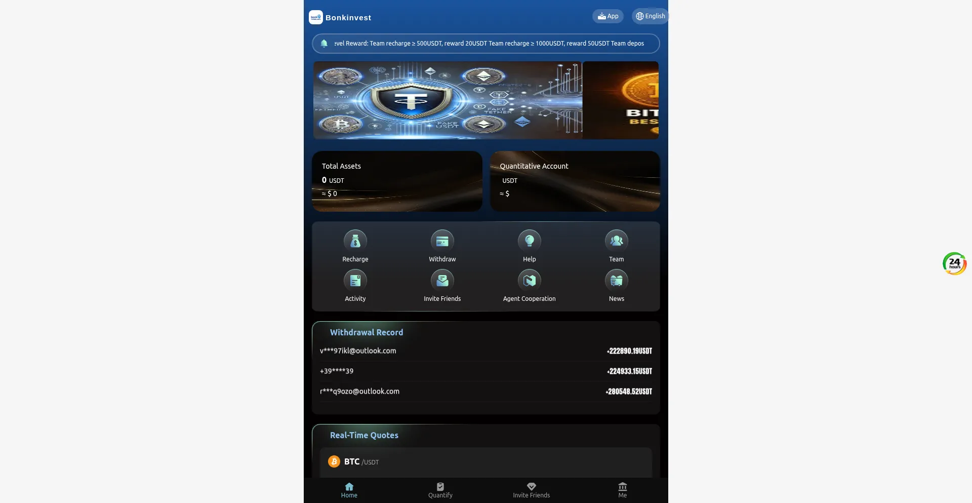 Bonkinvest.com 运营欺诈性金融平台,推广具有不现实回报承诺的欺骗性投资机会。安全分析表明该平台采用与 庞氏骗局 和预付费欺诈一致的策略,旨在提取用户资金和个人信息。