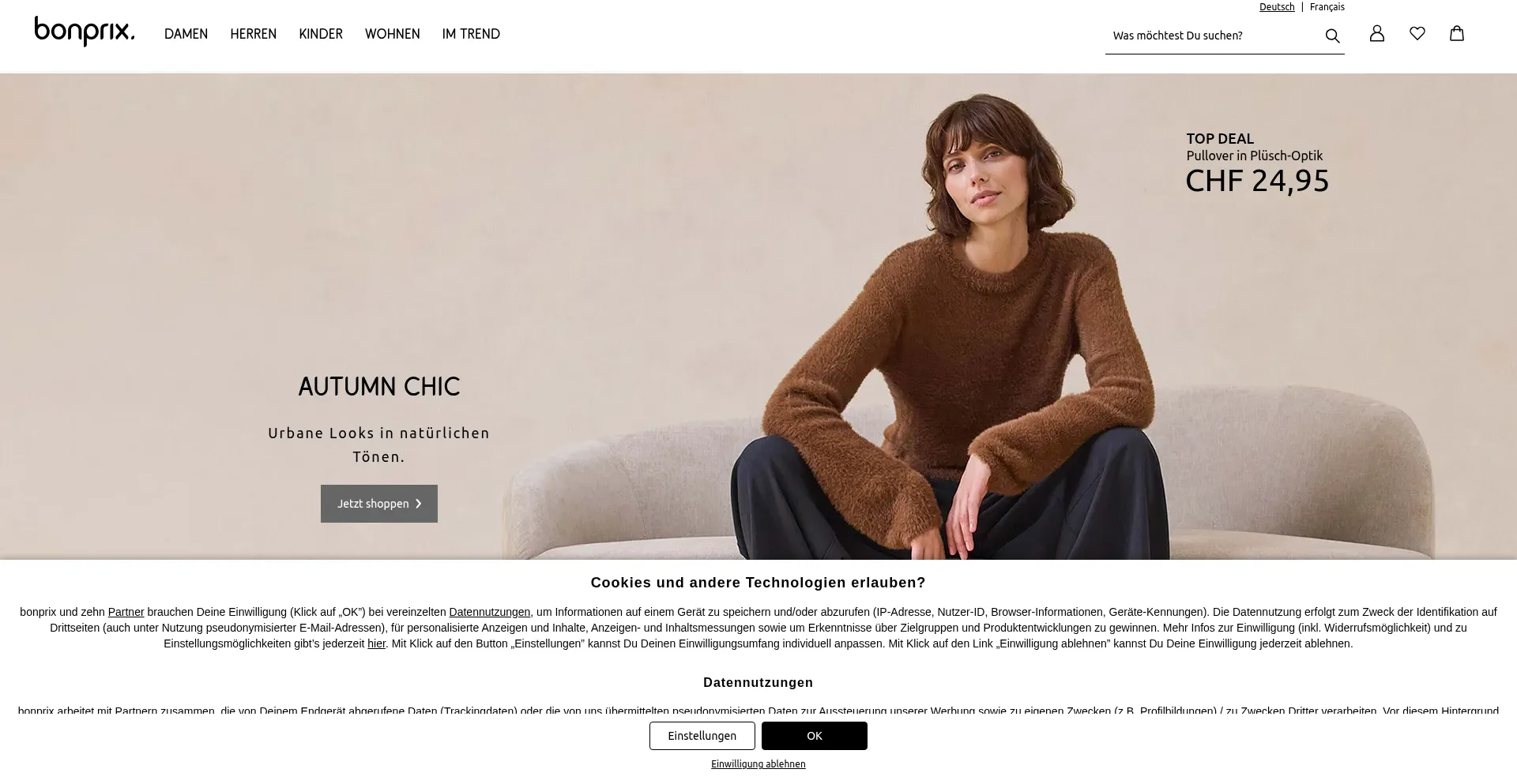网站上存在社交媒体链接表明 bonprix.ch 在社交媒体上维护官方账户,这是可信度和参与度的积极信号。