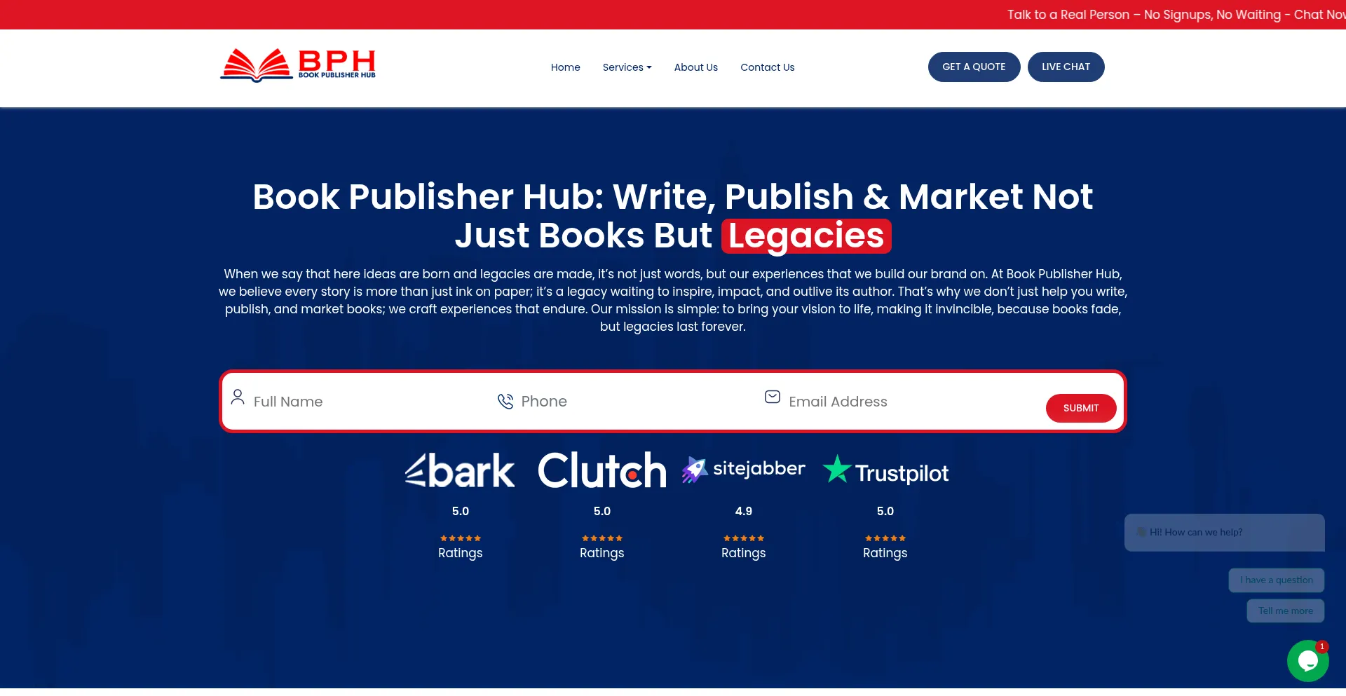 该网站实现数据收集表单,请求个人信息,包括姓名、电子邮件地址、电话号码或其他敏感详细信息。用户应验证 bookpublisherhub.com 的合法性并在提交个人数据前查看隐私政策。