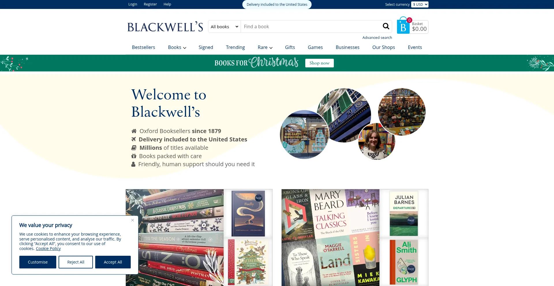 该网站实现符合GDPR或CCPA等隐私法规的cookie同意机制。这表明 bookshop.blackwell.co.uk 遵守数据保护标准并为用户提供对个人数据收集实践的控制。