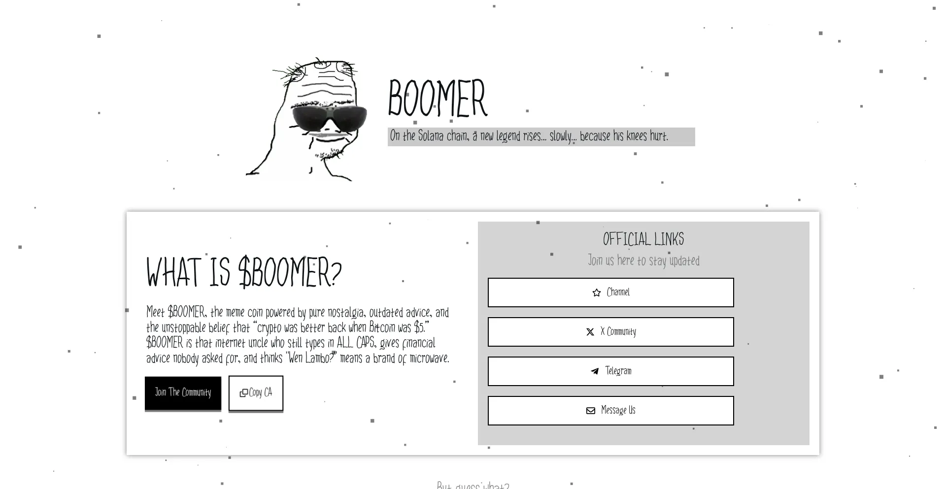 BOOMER – On the Solana chain, a new legend rises… slowly… because his knees hurt. Meet $BOOMER, the meme coin powered by pure nostalgia, outdated advice, and the unstoppable belief that “crypto was better back when Bitcoin was $5.”