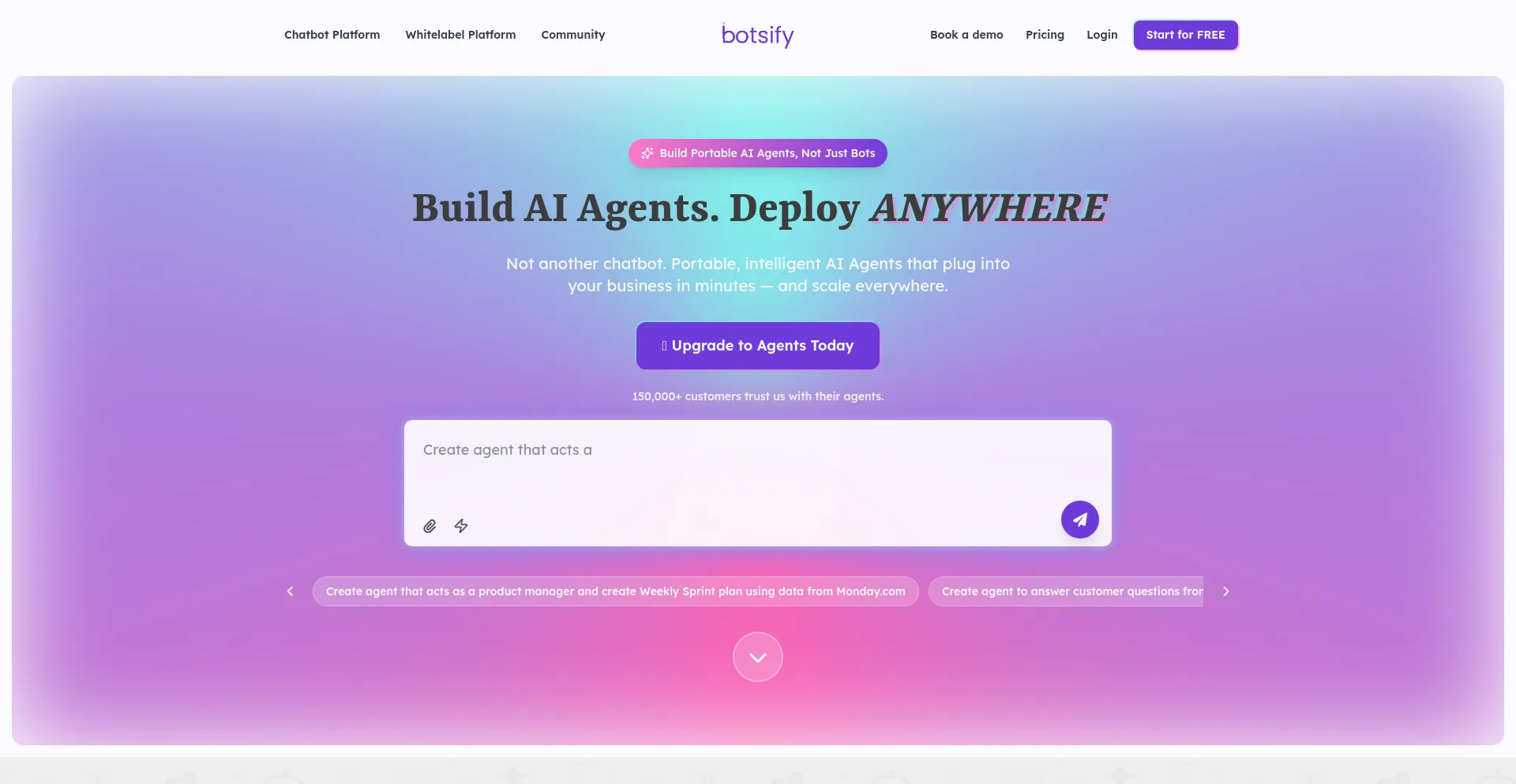 Botsify lets you build portable AI agents in seconds — deploy them across social platforms and LLMs, integrate with APIs & MCPs through one intelligent agent.