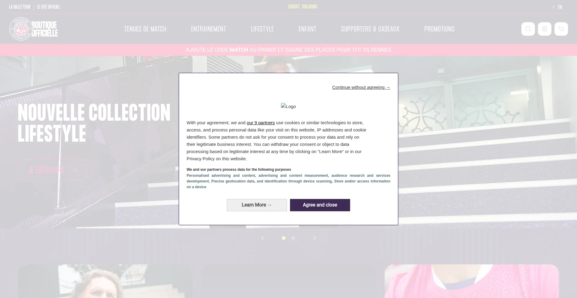 该网站实现符合GDPR或CCPA等隐私法规的cookie同意机制。这表明 boutique.toulousefc.com 遵守数据保护标准并为用户提供对个人数据收集实践的控制。