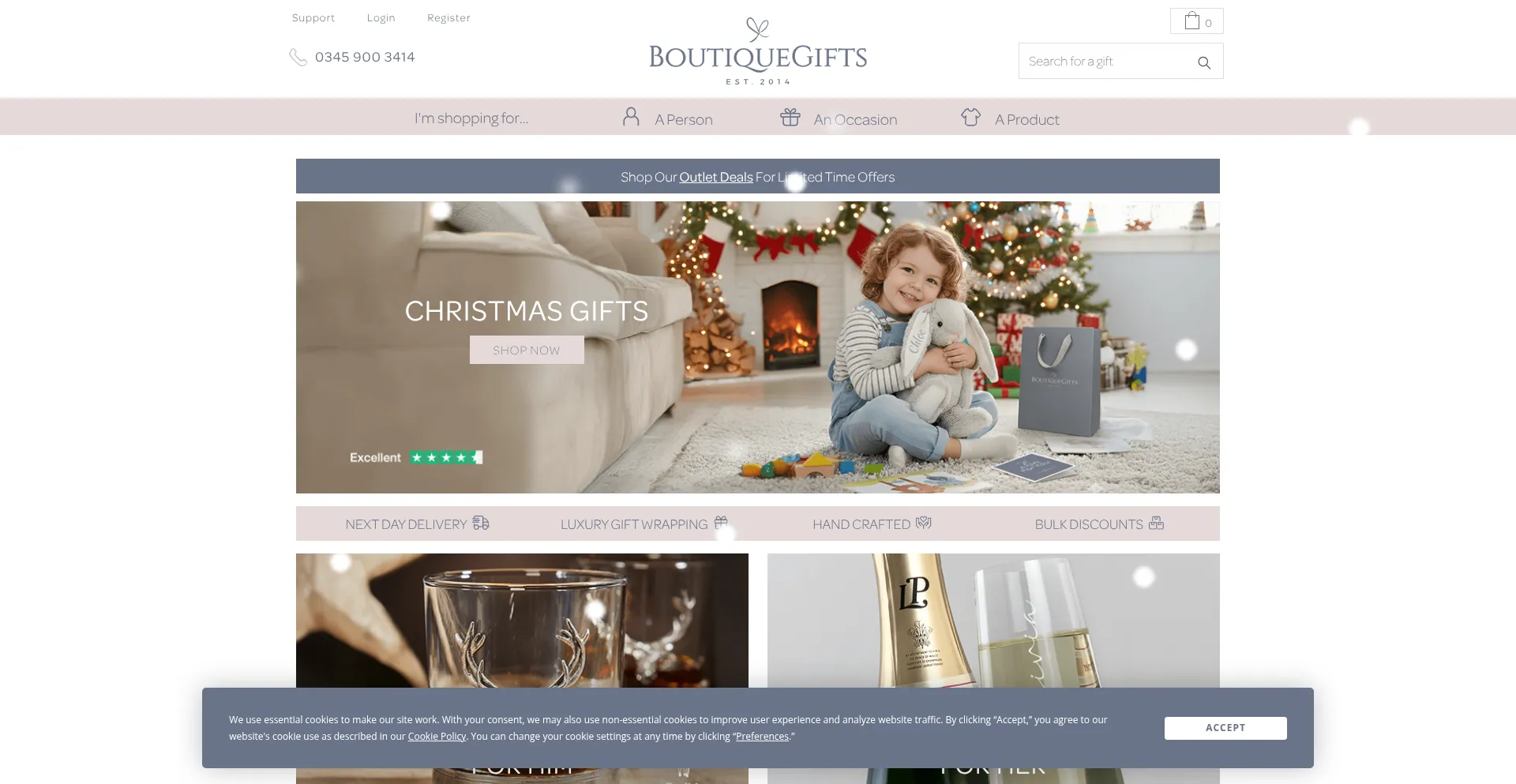 该网站实现符合GDPR或CCPA等隐私法规的cookie同意机制。这表明 boutiquegifts.co.uk 遵守数据保护标准并为用户提供对个人数据收集实践的控制。