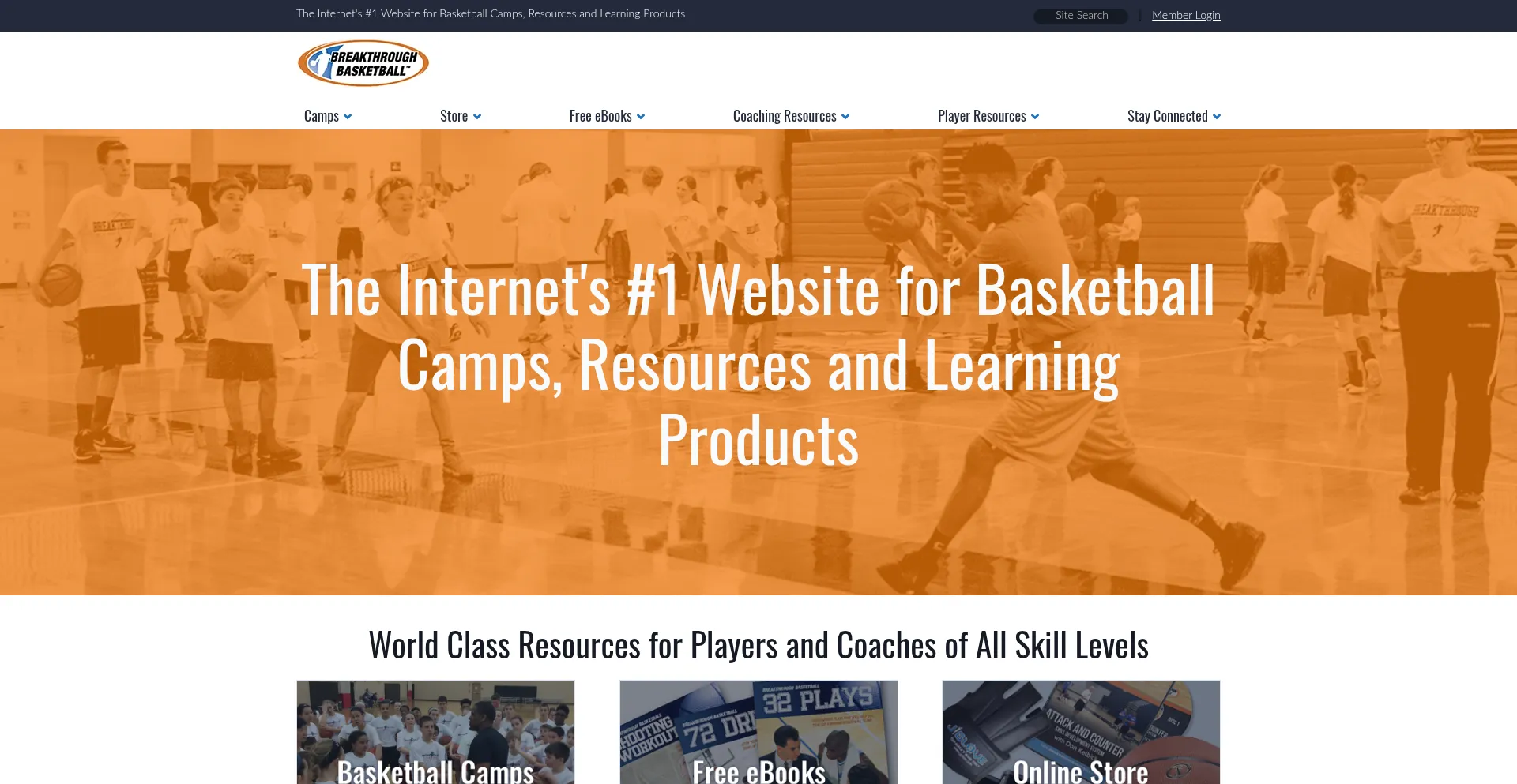 Main Navigation Page: Details Basketball camps, resources, and store products