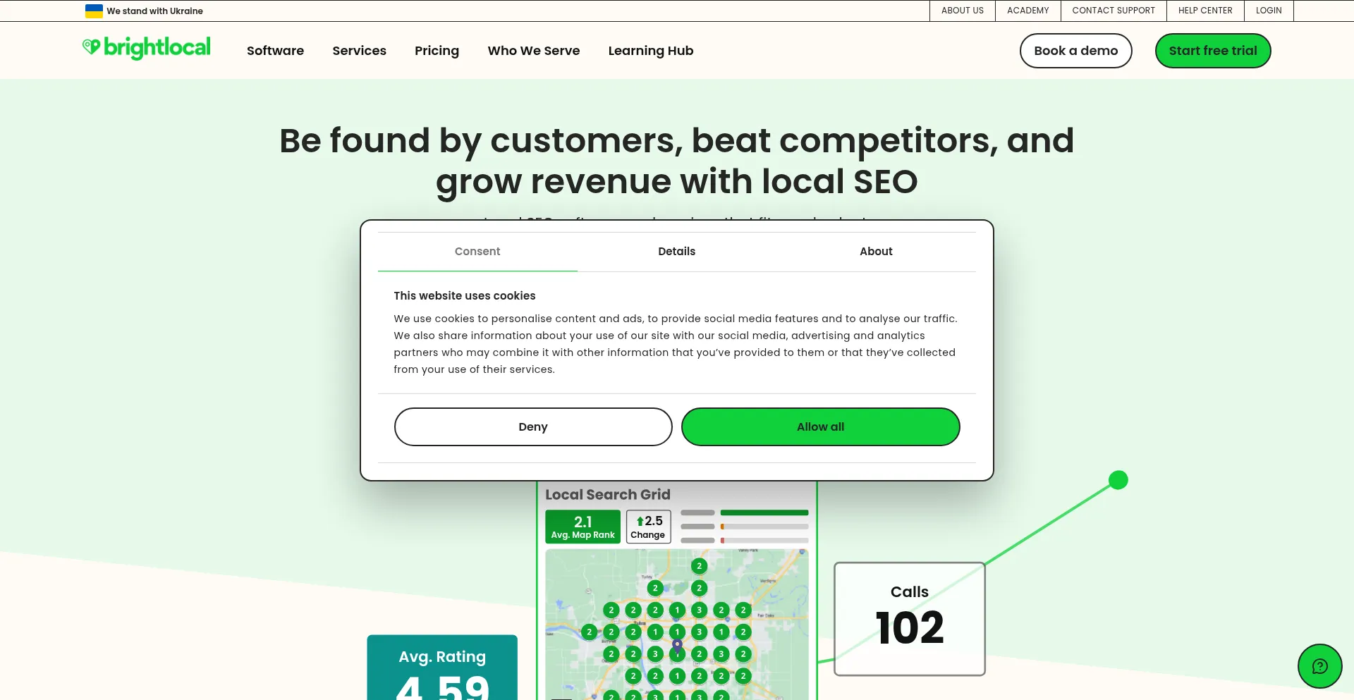 该网站实现符合GDPR或CCPA等隐私法规的cookie同意机制。这表明 brightlocal.com 遵守数据保护标准并为用户提供对个人数据收集实践的控制。