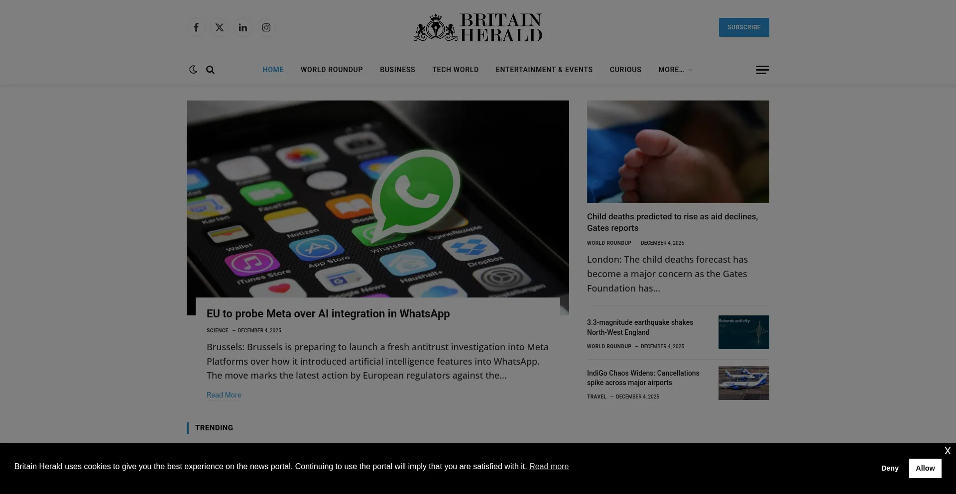 该网站实现符合GDPR或CCPA等隐私法规的cookie同意机制。这表明 britainherald.com 遵守数据保护标准并为用户提供对个人数据收集实践的控制。