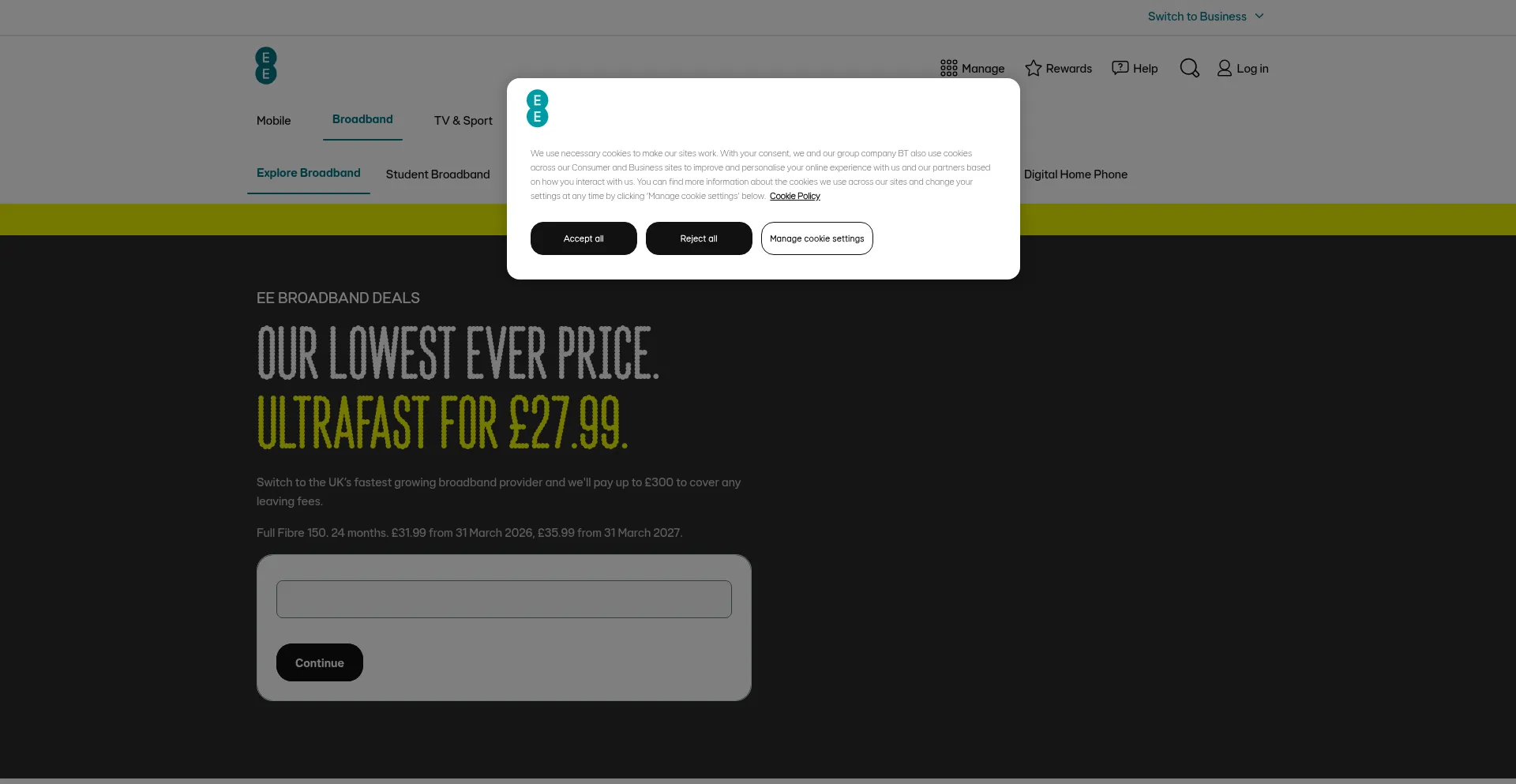 该网站实现符合GDPR或CCPA等隐私法规的cookie同意机制。这表明 broadband.ee.co.uk 遵守数据保护标准并为用户提供对个人数据收集实践的控制。