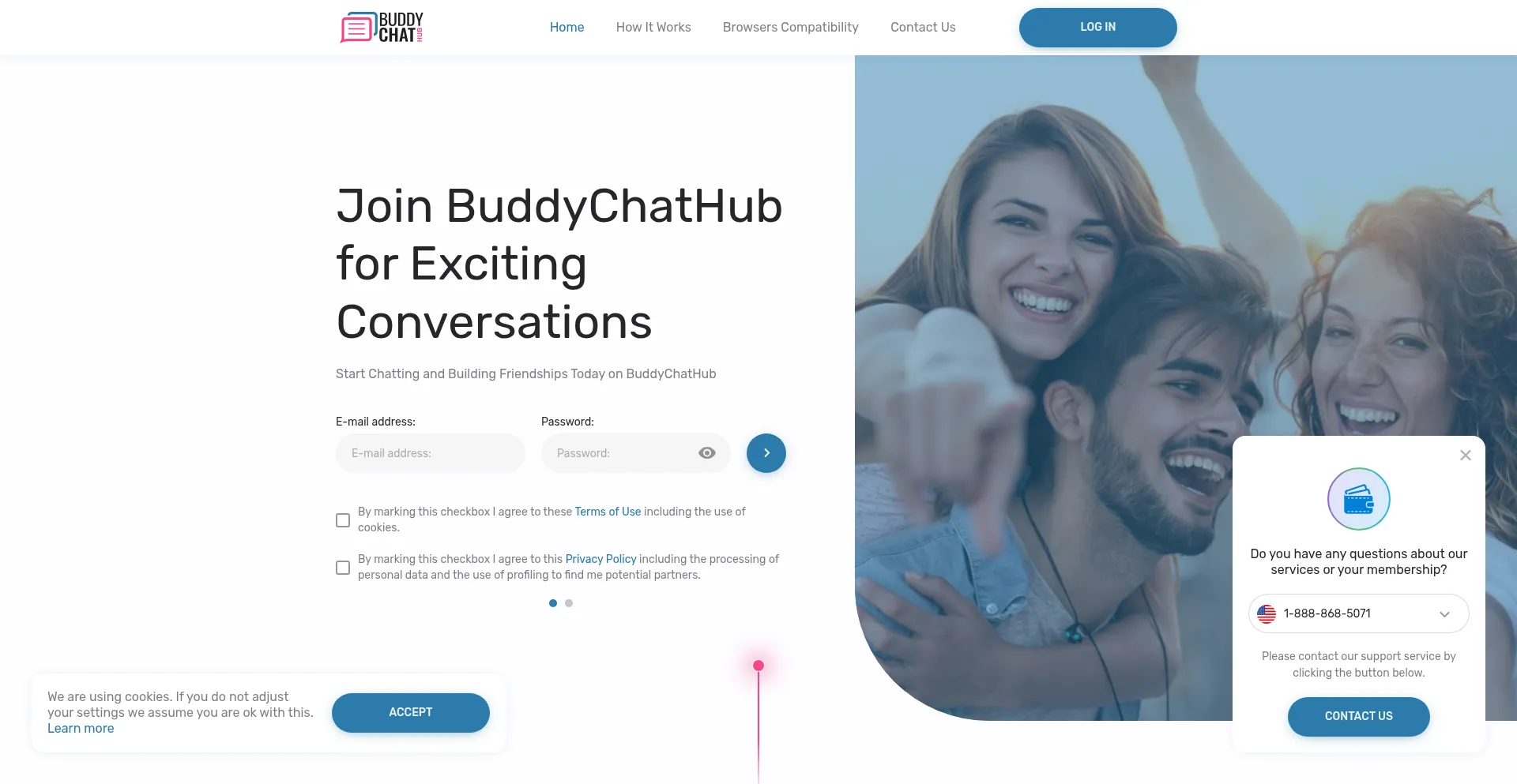 该网站实现数据收集表单,请求个人信息,包括姓名、电子邮件地址、电话号码或其他敏感详细信息。用户应验证 buddychathub.com 的合法性并在提交个人数据前查看隐私政策。