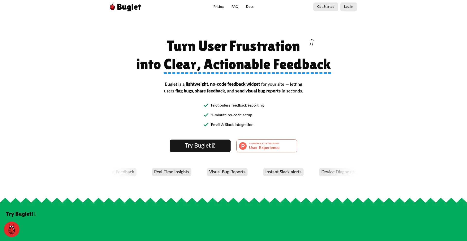 Buglet is a lightweight, no-code widget for capturing visual bug reports directly from your users. Fast setup, clear feedback, happier customers.