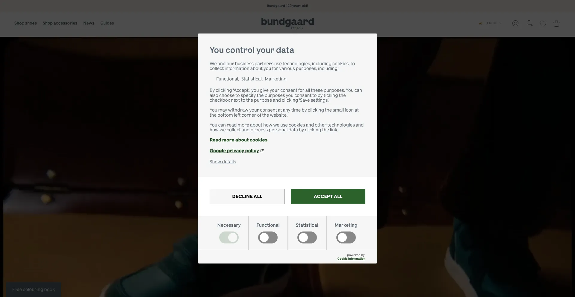 该网站实现符合GDPR或CCPA等隐私法规的cookie同意机制。这表明 bundgaardshoes.com 遵守数据保护标准并为用户提供对个人数据收集实践的控制。