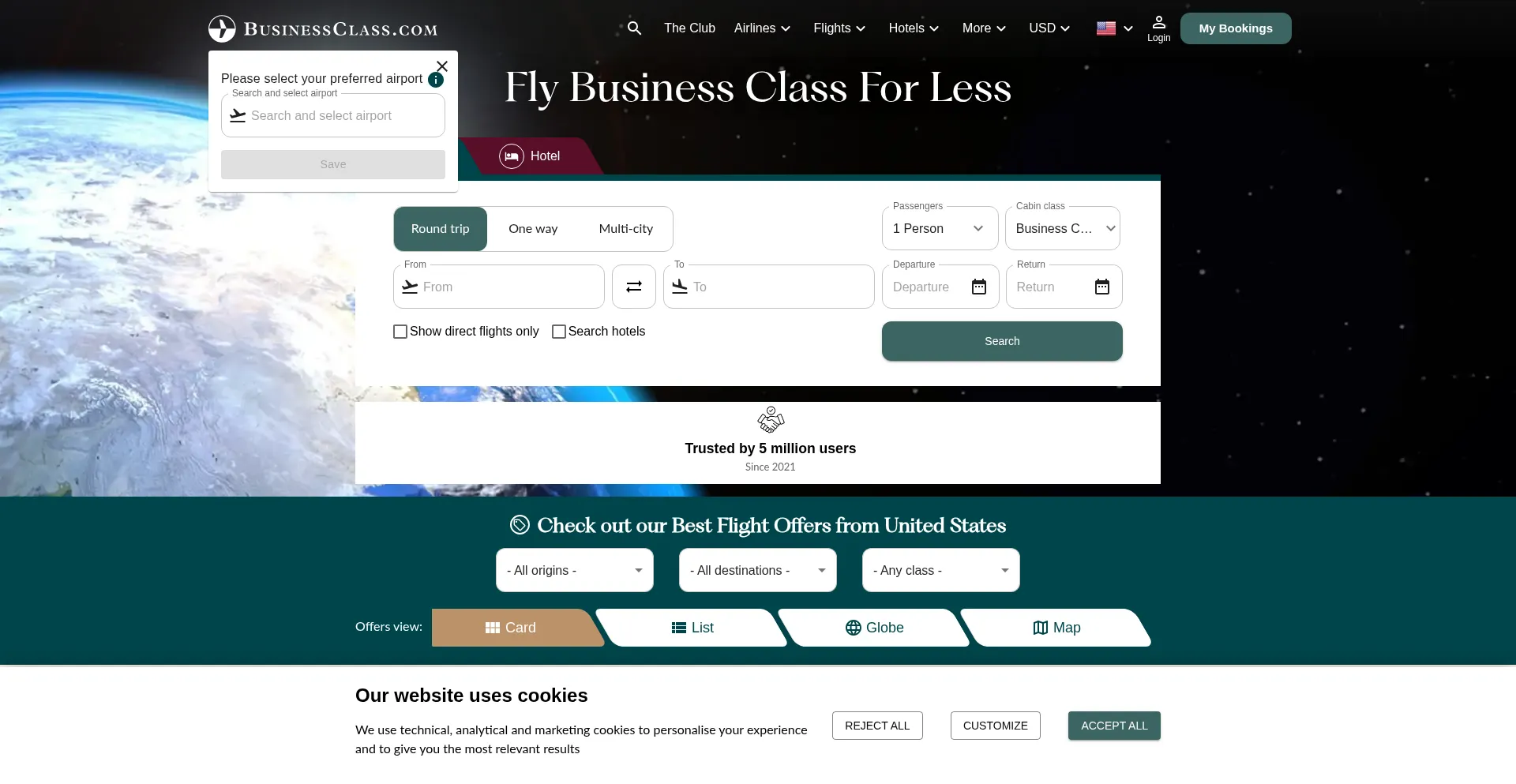 BusinessClass.com searches hundreds of travel sites at once to help you find the best premium travel offers for flights and hotels.