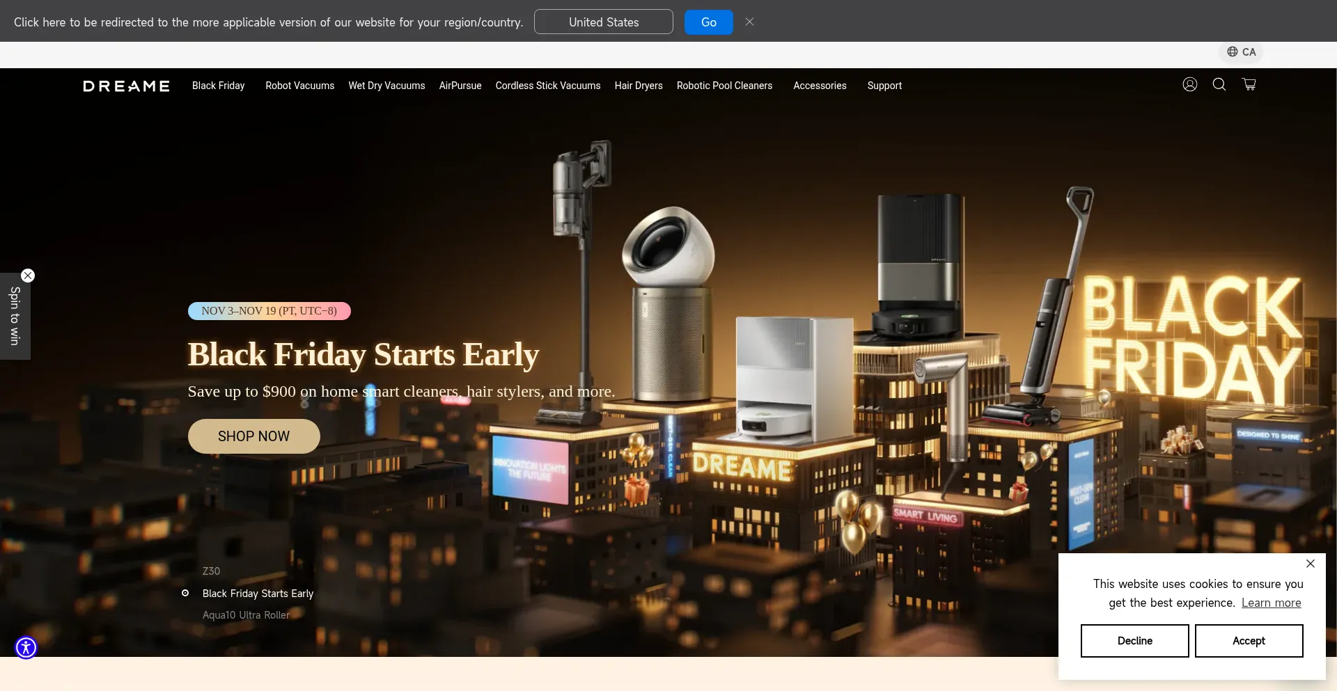 该网站实现符合GDPR或CCPA等隐私法规的cookie同意机制。这表明 ca.dreametech.com 遵守数据保护标准并为用户提供对个人数据收集实践的控制。