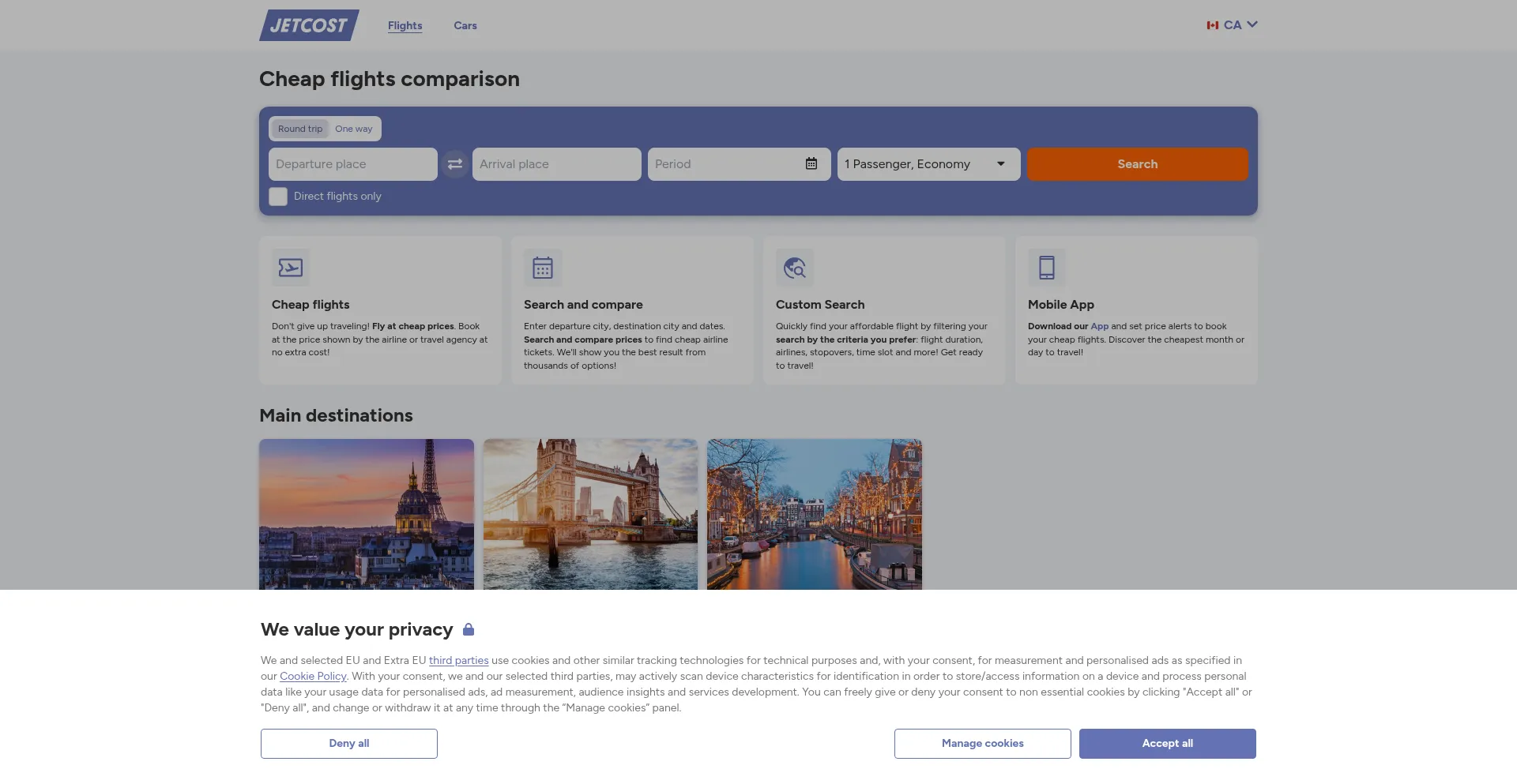 该网站实现符合GDPR或CCPA等隐私法规的cookie同意机制。这表明 ca.jetcost.com 遵守数据保护标准并为用户提供对个人数据收集实践的控制。