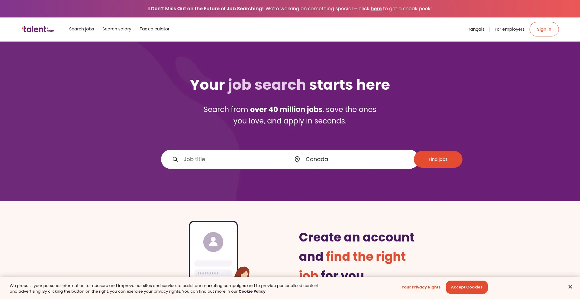 该网站实现数据收集表单,请求个人信息,包括姓名、电子邮件地址、电话号码或其他敏感详细信息。用户应验证 ca.talent.com 的合法性并在提交个人数据前查看隐私政策。