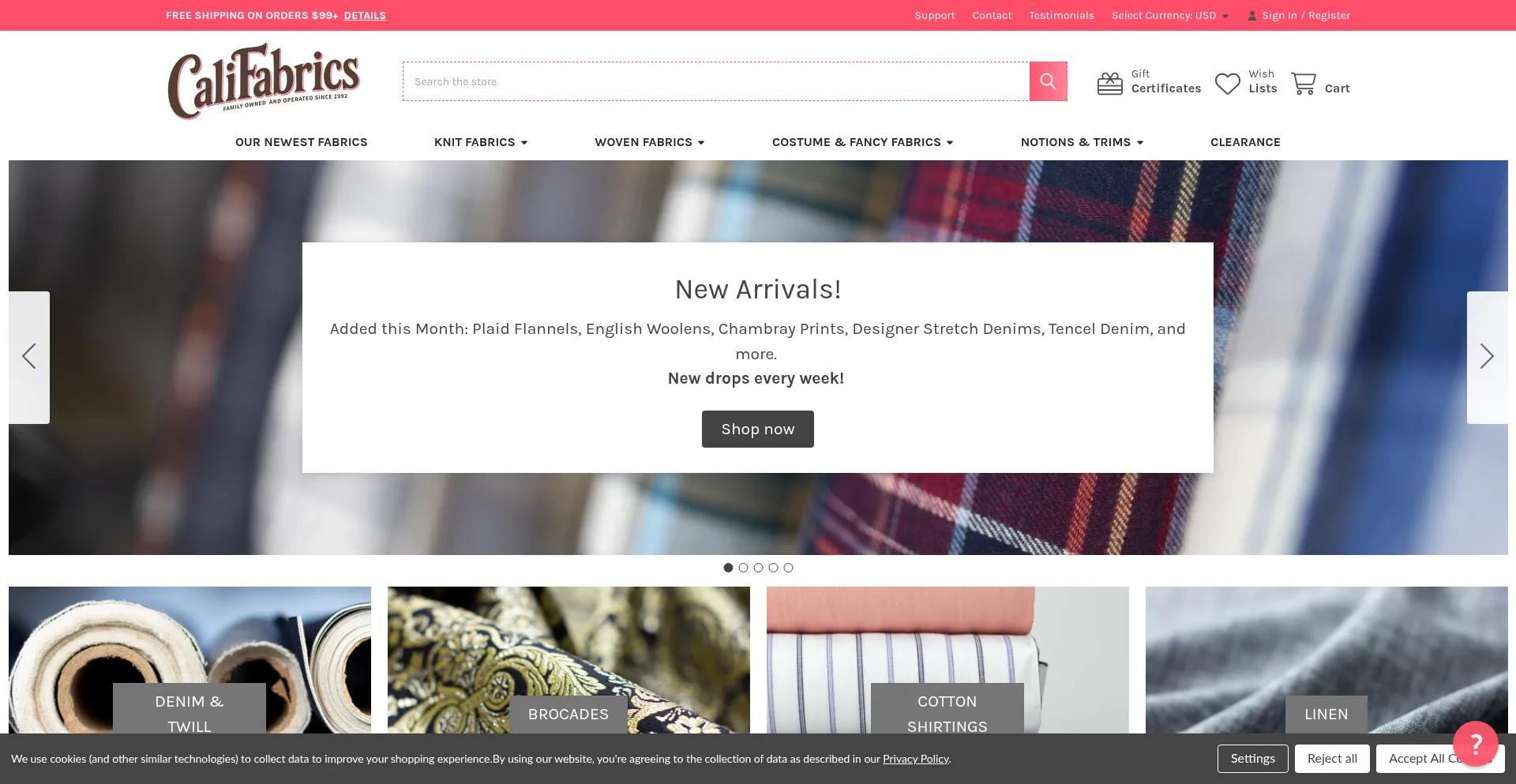 该网站实现符合GDPR或CCPA等隐私法规的cookie同意机制。这表明 califabrics.com 遵守数据保护标准并为用户提供对个人数据收集实践的控制。