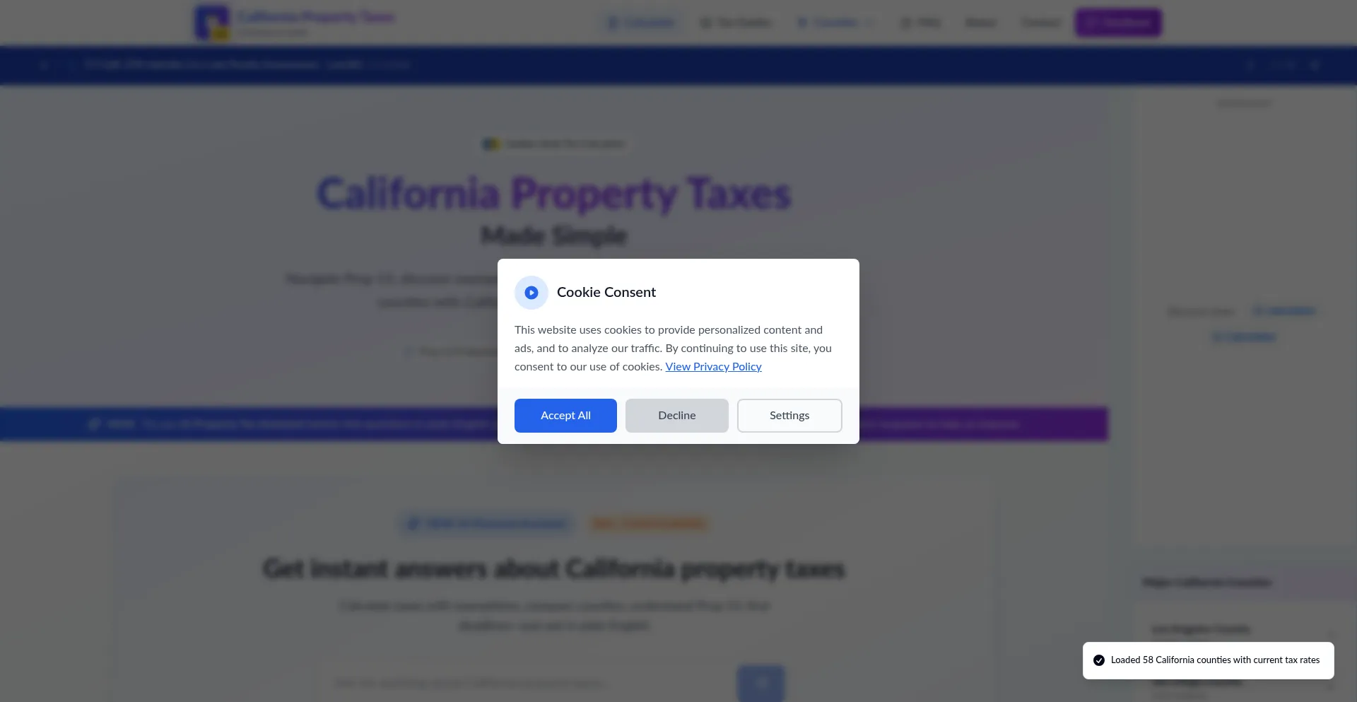 Calculate 2025 California property taxes for all 58 counties. Free calculator with homestead exemptions, Prop 13 cap, and portability. Updated rates.