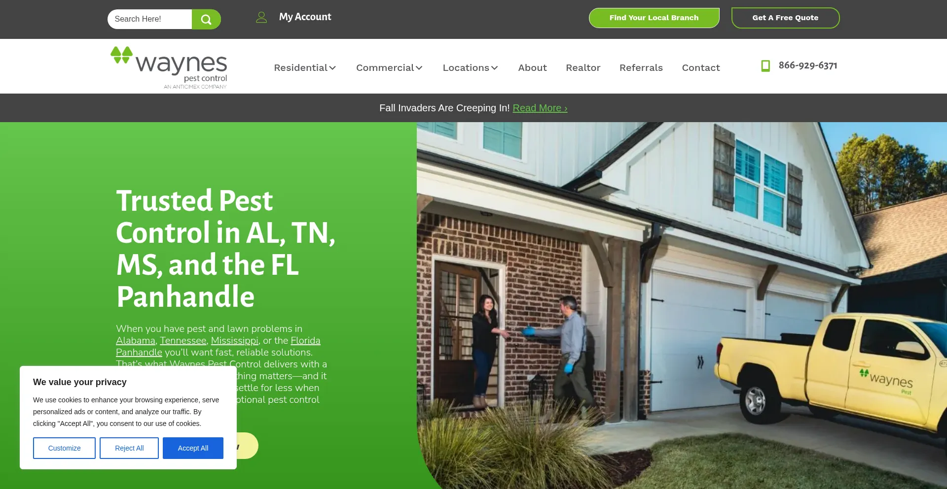 When you’ve got pest problems, you’ll want fast, reliable solutions. That’s just what Waynes Pest Control delivers in Alabama, Tennessee, and Mississippi: 1-866-929-6371.