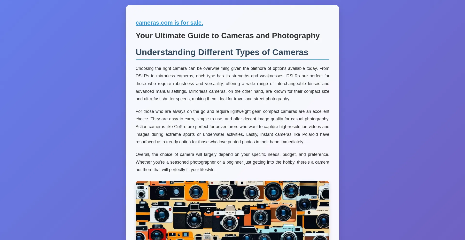 该域名在延长期间保持活跃状态,表明运营稳定性和已建立的网络存在。cameras.com 的这种长寿性表明合法的商业运营和随时间推移的持续用户参与。