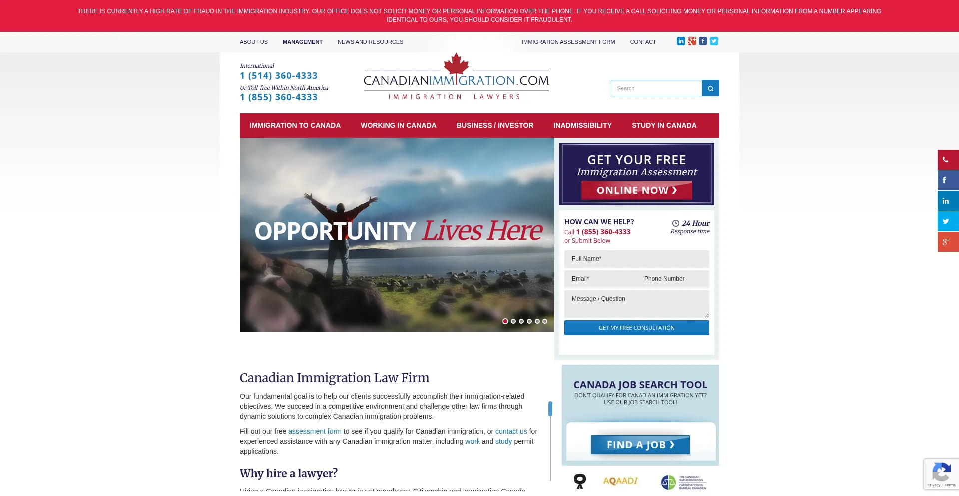 网站上存在社交媒体链接表明 canadianimmigration.com 在社交媒体上维护官方账户,这是可信度和参与度的积极信号。