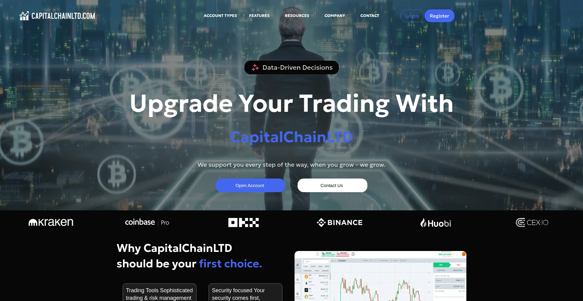 该网站实现数据收集表单,请求个人信息,包括姓名、电子邮件地址、电话号码或其他敏感详细信息。用户应验证 capitalchainltd.com 的合法性并在提交个人数据前查看隐私政策。