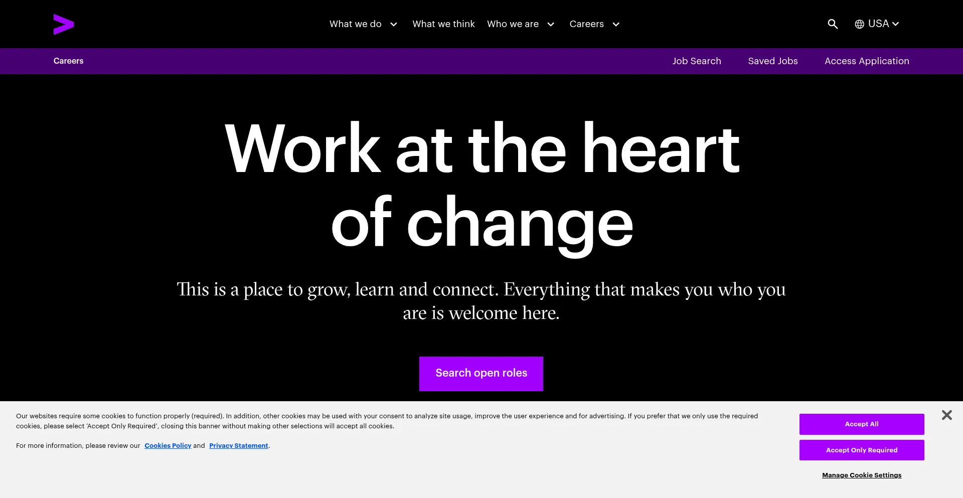 该网站实现符合GDPR或CCPA等隐私法规的cookie同意机制。这表明 careers.accenture.com 遵守数据保护标准并为用户提供对个人数据收集实践的控制。