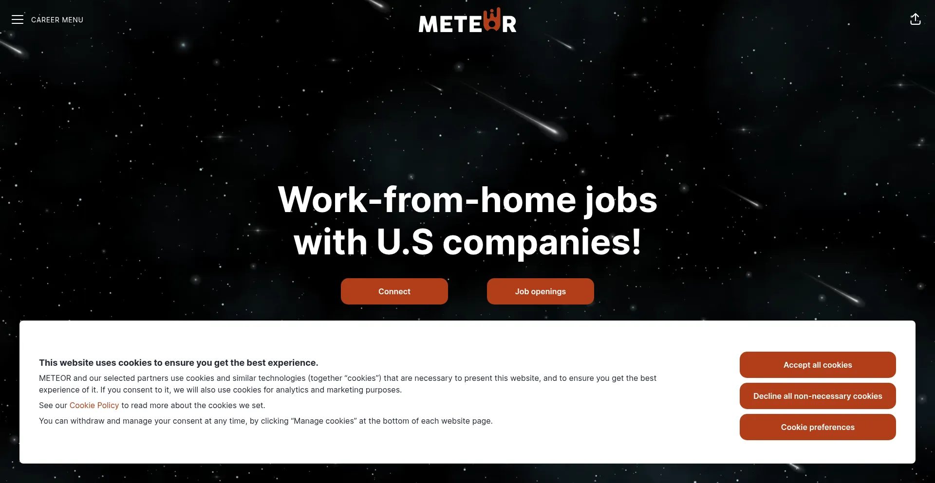 该网站实现符合GDPR或CCPA等隐私法规的cookie同意机制。这表明 careers.trymeteor.com 遵守数据保护标准并为用户提供对个人数据收集实践的控制。