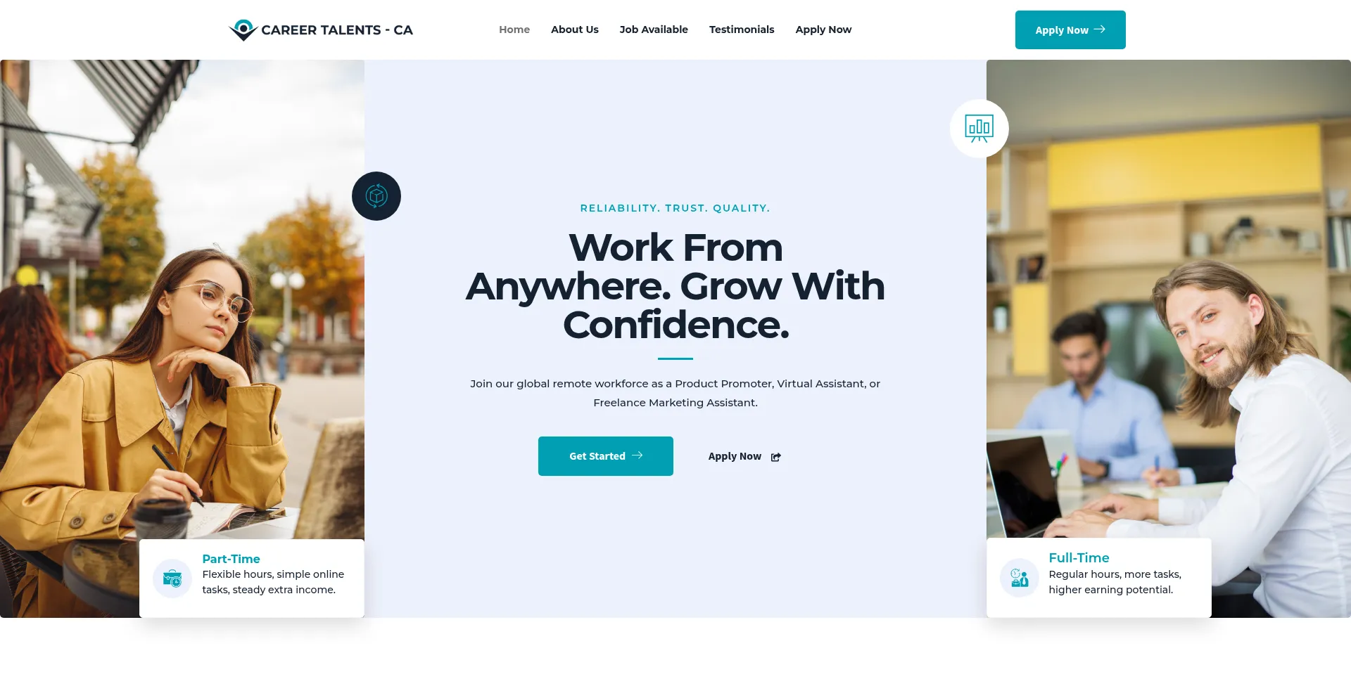 该网站实现数据收集表单,请求个人信息,包括姓名、电子邮件地址、电话号码或其他敏感详细信息。用户应验证 careertalents-ca.com 的合法性并在提交个人数据前查看隐私政策。