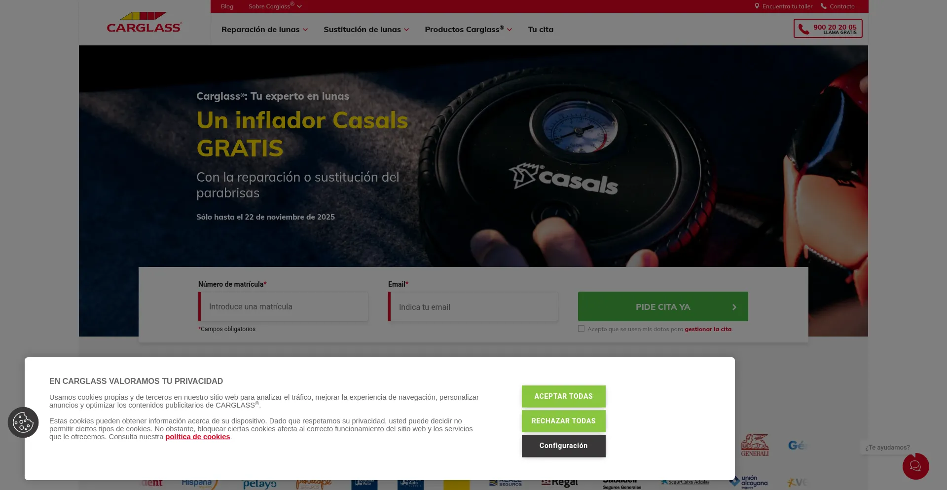 该网站实现符合GDPR或CCPA等隐私法规的cookie同意机制。这表明 carglass.es 遵守数据保护标准并为用户提供对个人数据收集实践的控制。