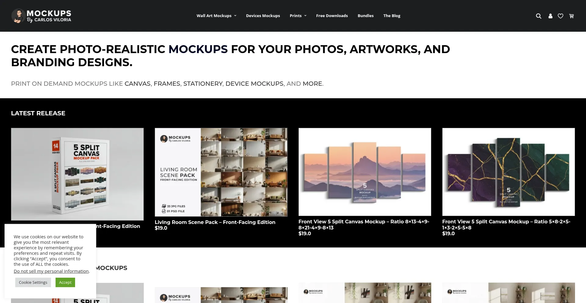 Carlos Viloria offers a wide range of print on demand mockups, including canvas mockups, frame mockups, stationery mockups, and urban t-shirt mockups.