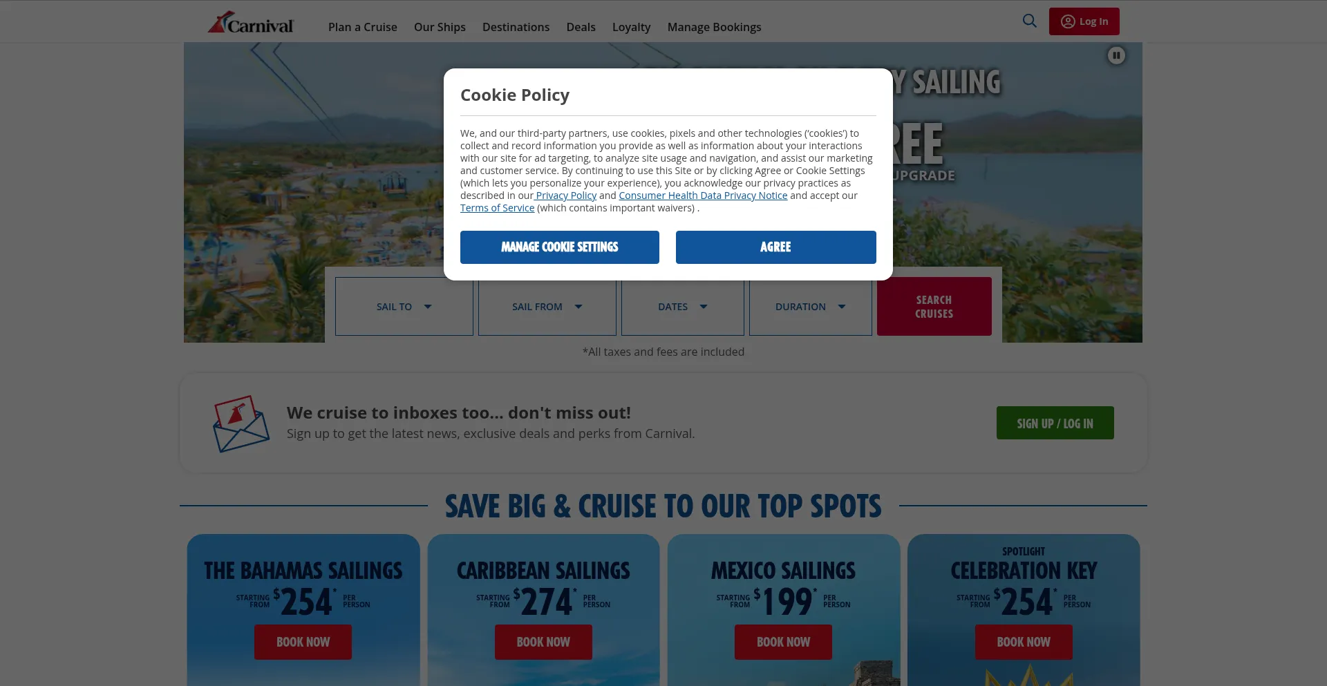 该网站实现符合GDPR或CCPA等隐私法规的cookie同意机制。这表明 carnival.com 遵守数据保护标准并为用户提供对个人数据收集实践的控制。