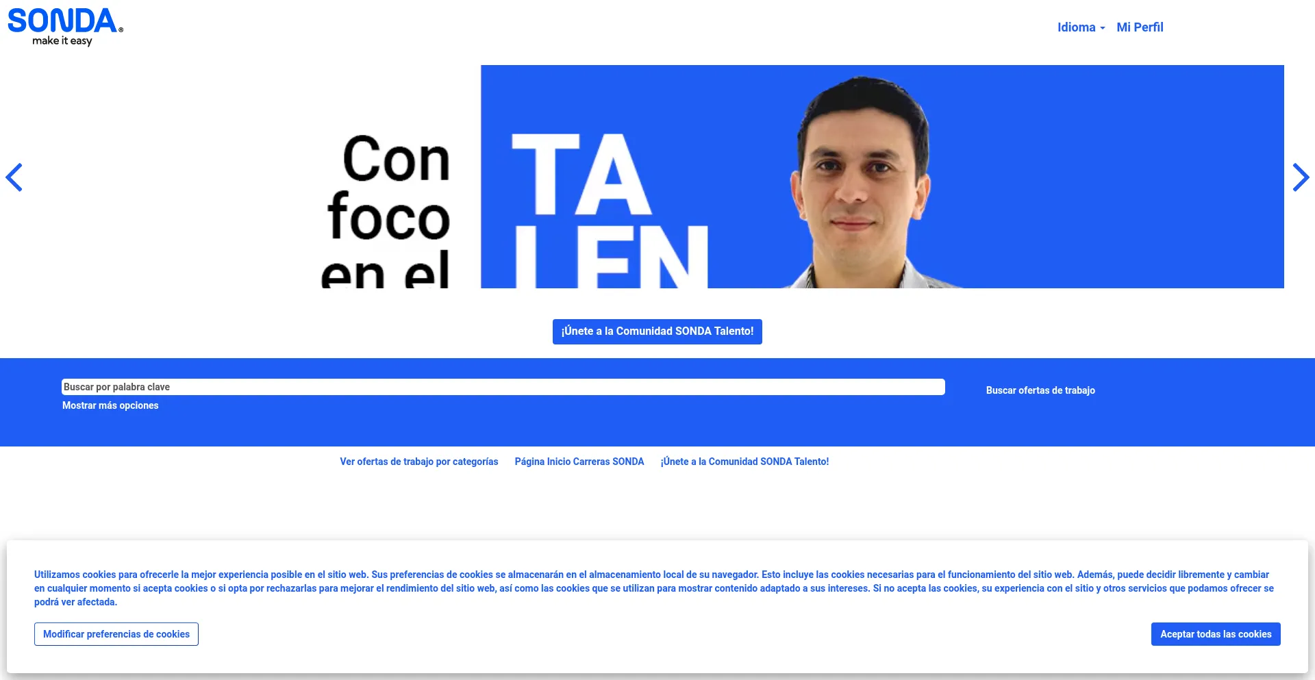 carrera.sonda.com 使用 Bootstrap,这是一个广泛采用的开源响应式网页开发框架。Bootstrap 通过标准化组件和样式实现移动友好界面的高效创建。