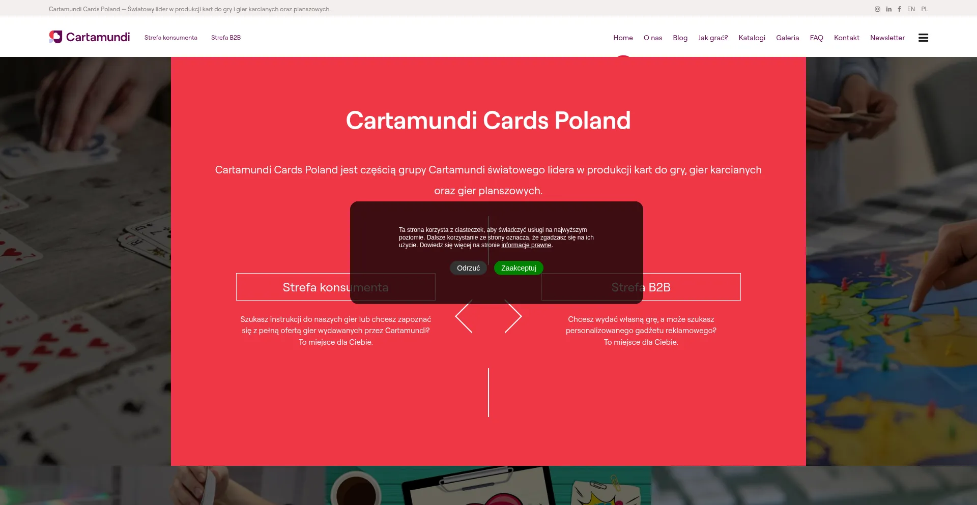 网站上存在社交媒体链接表明 cartamundi.pl 在社交媒体上维护官方账户,这是可信度和参与度的积极信号。