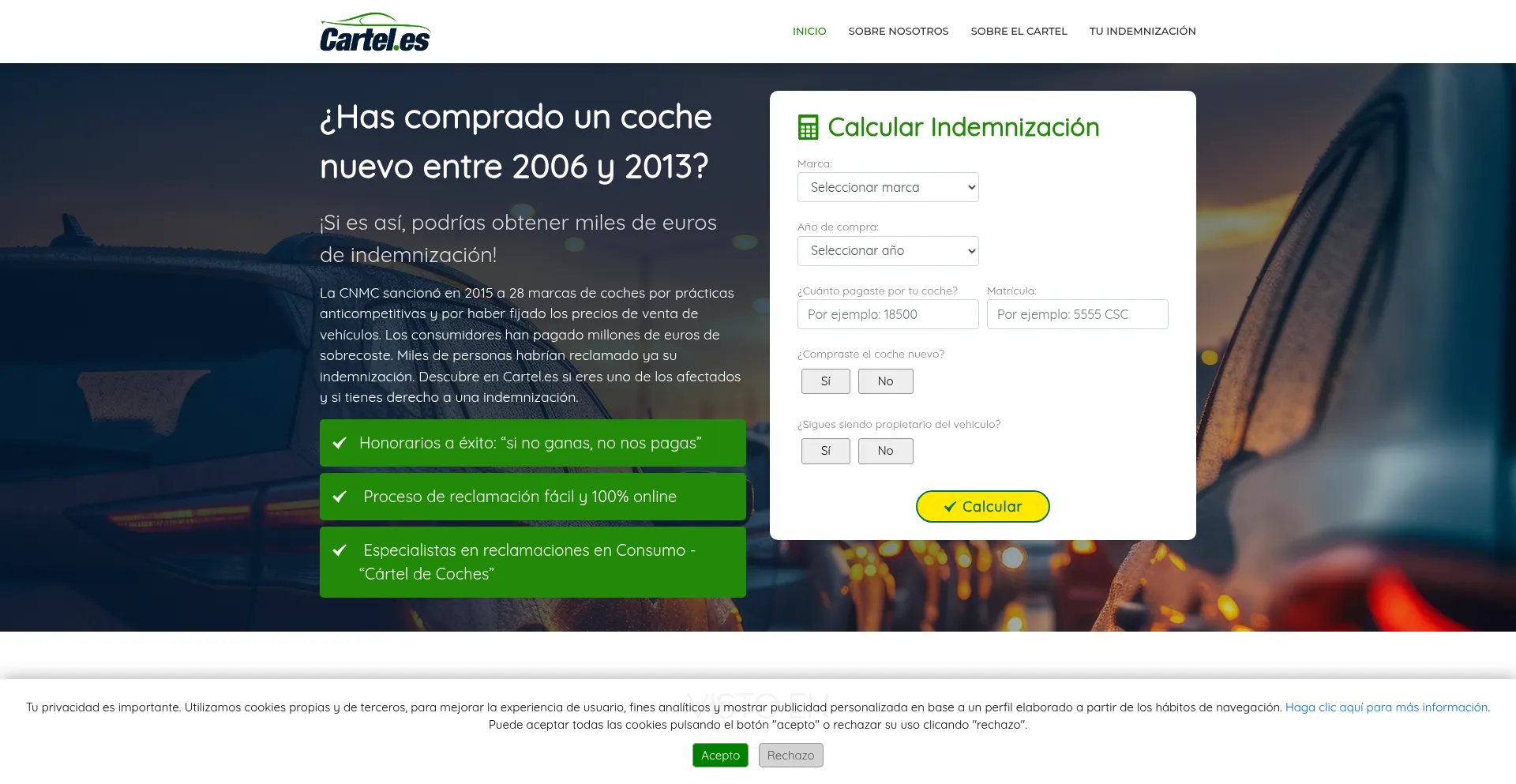 该网站实现数据收集表单,请求个人信息,包括姓名、电子邮件地址、电话号码或其他敏感详细信息。用户应验证 cartel.es 的合法性并在提交个人数据前查看隐私政策。