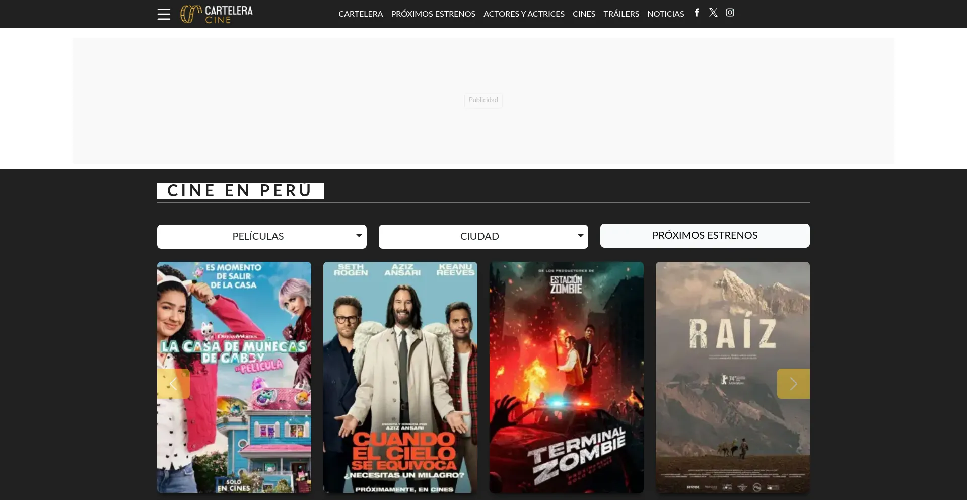 Cartelera de cine en los teatros y salas de las principales ciudades de Perú. Películas, estrenos, próximos estrenos, recomendados, noticias, trailers.