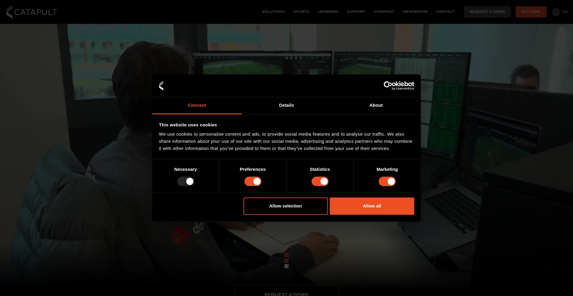 该网站实现符合GDPR或CCPA等隐私法规的cookie同意机制。这表明 catapultsports.com 遵守数据保护标准并为用户提供对个人数据收集实践的控制。